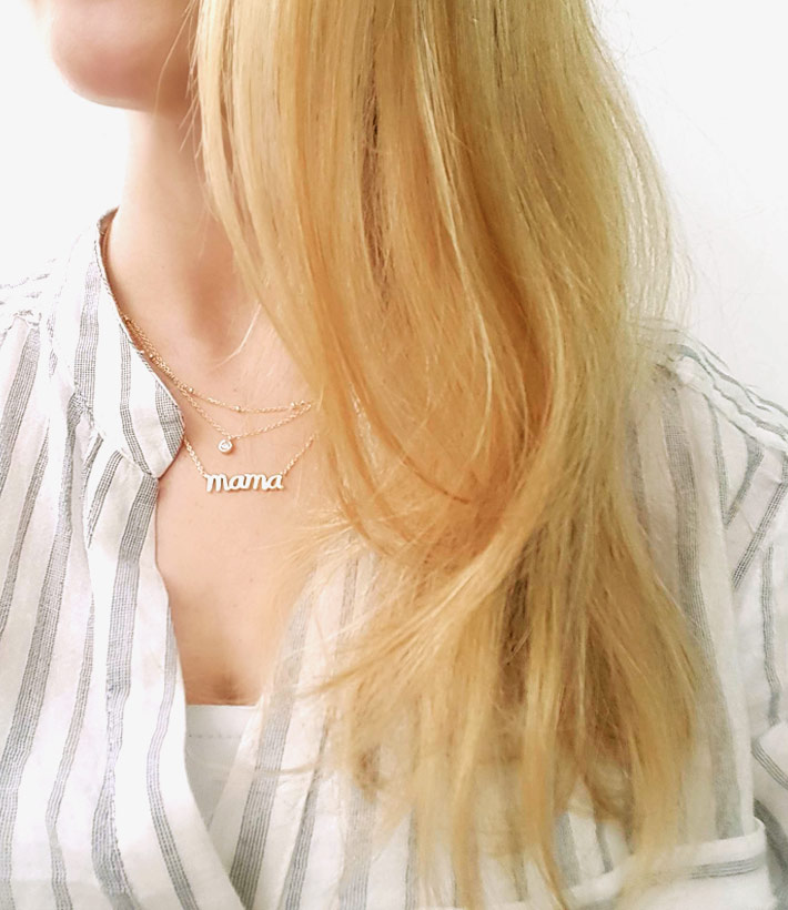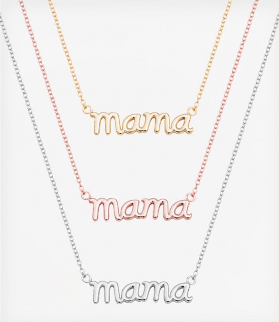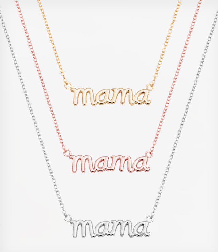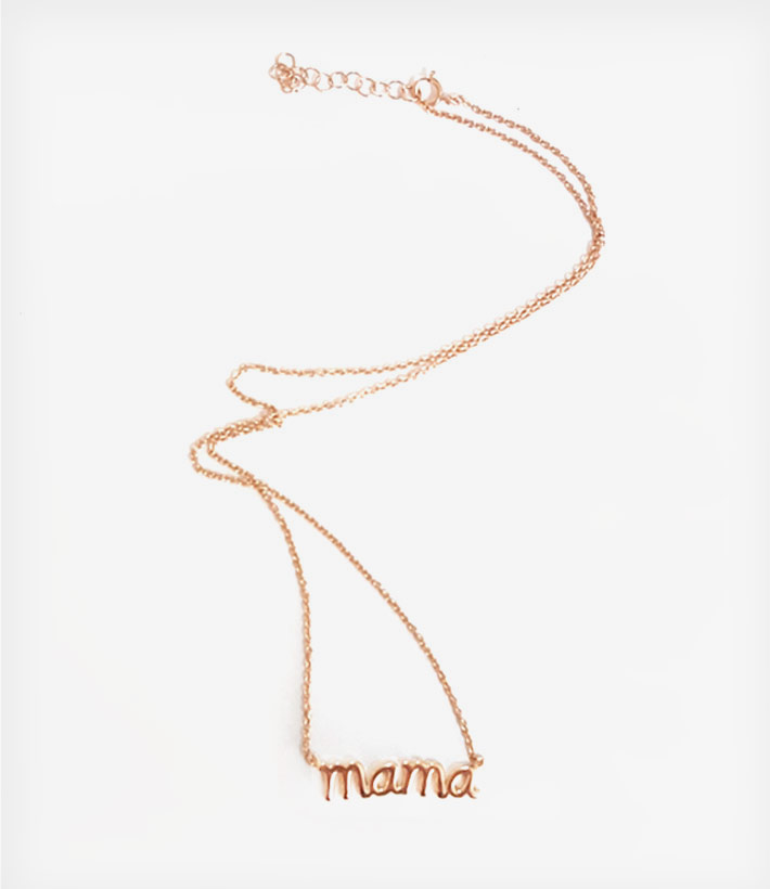 Ένα υπέροχο ασημένιο κολιέ επιχρυσωμένο με την λέξη mama (μαμά). Ένα κόσμημα μοντέρνο και σικ για τις υπέροχες μανούλες.