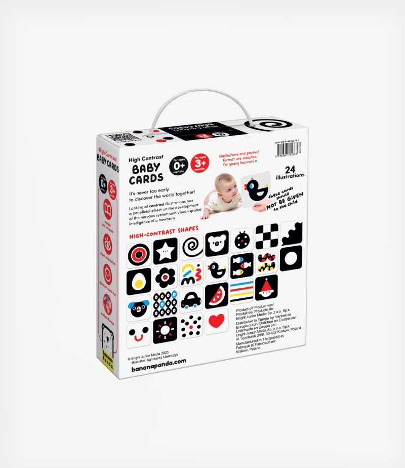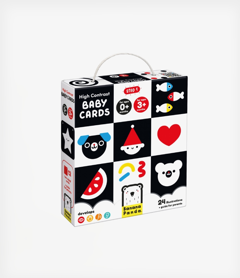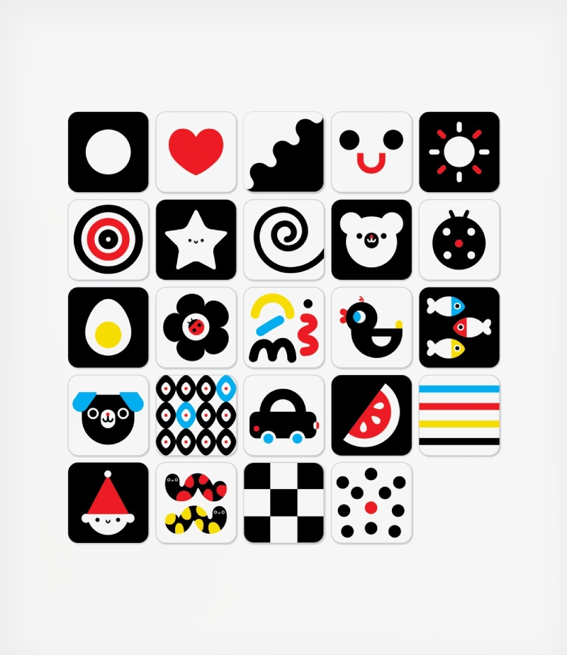 Κατά τη γέννηση, η όραση είναι ακόμη υπανάπτυκτη. Στην αρχή τα μωρά βλέπουν καλύτερα τα καθαρά μοτίβα που έχουν μεγάλες αντιθέσεις, ενώ η ικανότητα τους να διακρίνουν τις λεπτομέρειες και τα χρώματα της εικόνας αναπτύσσεται σταδιακά τους επόμενους μήνες. Γι’ αυτό στα μωρά αρέσουν τόσο πολύ οι αντιθέσεις. Οι γονείς μπορούν να κρεμάσουν ένα φυλλάδιο ή μια-μια τις κάρτες δίπλα στο κρεβάτι ή το καρότσι ή να δημιουργήσουν μια γιρλάντα από αυτές. Πολλές ενδιαφέρουσες και πρακτικές πληροφορίες σχετικά με την ανάπτυξη των μωρών και τρόπους για να διασκεδάσετε μαζί τους μπορείτε να βρείτε στον οδηγό που περιλαμβάνεται στο σετ.
