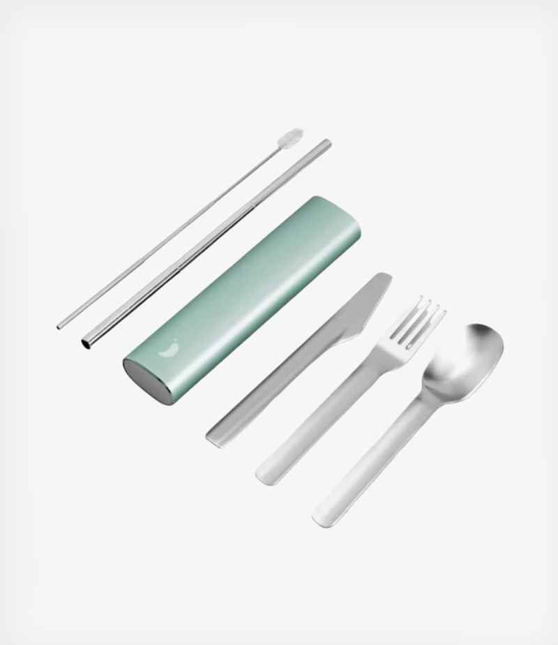 Περιλαμβάνει πιρούνι από ανοξείδωτο χάλυβα, κοφτερό μαχαίρι, κουτάλι, τηλεσκοπικό καλαμάκι και βουρτσάκι.