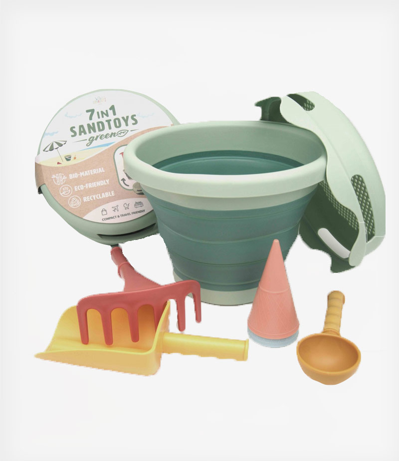 Με το 7 in 1 κουβαδάκι έχετε ένα πλήρες, οργανικό, σετ παιχνιδιών άμμου για σκάψιμο, σχηματισμό, κοσκίνισμα και τσουγκράνισμα.