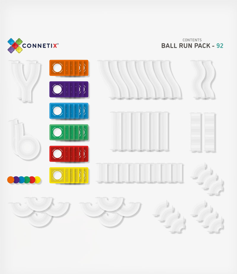 Το Connetix BALL RUN PACK είναι ένα σετ 92 τεμαχίων με πρωταγωνιστές τα μοναδικά τουβλάκια μαγνήτες με τα αποκλειστικά σχεδιαστικά χαρακτηριστικά: