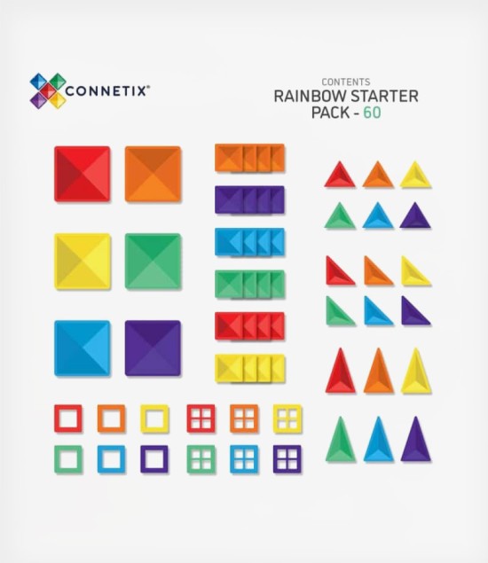 Με μεγάλα και μικρά τετράγωνα, καθώς και τρεις τύπους τριγώνων σε έξι ζωηρά χρώματα ουράνιου τόξου, αυτό το πακέτο είναι η τέλεια εισαγωγή στο παιχνίδι Connetix ή ως προσθήκη στις αυξανόμενες συλλογές μαγνητικών πλακιδίων.