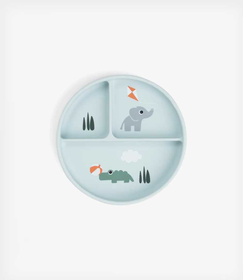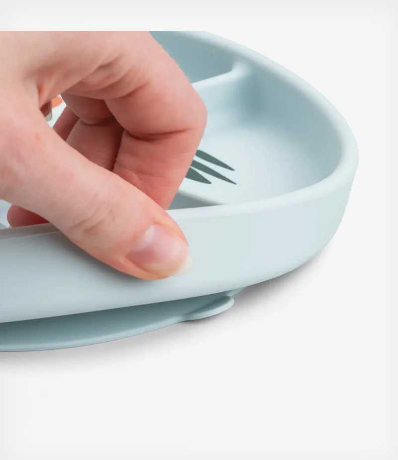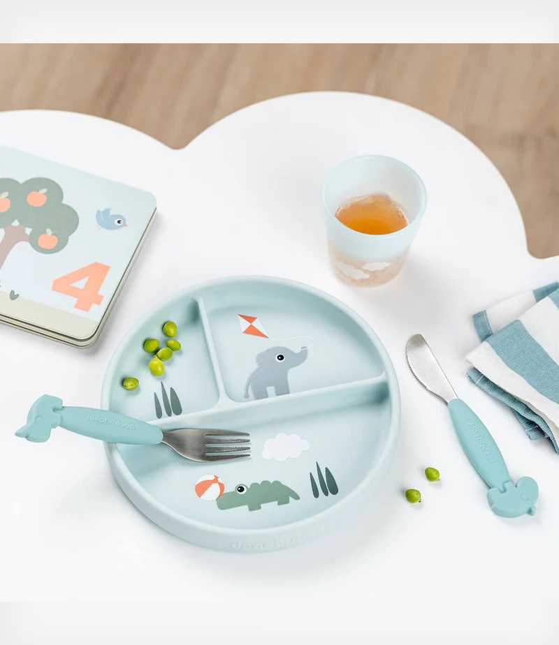 Πιάτο σιλικόνης με 3 χωρίσματα σε μπλε χρώμα της εταιρείας Done by Deer. Προάγει την αυτοτροφοδοσία και τις λεπτές κινητικές δεξιότητες του παιδιού.