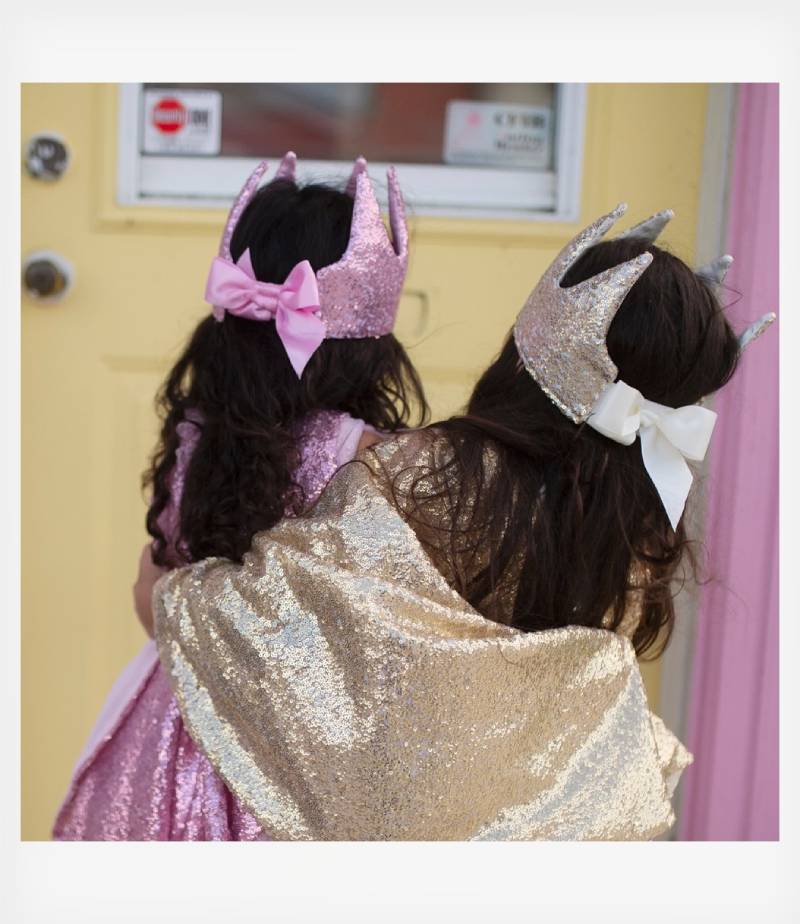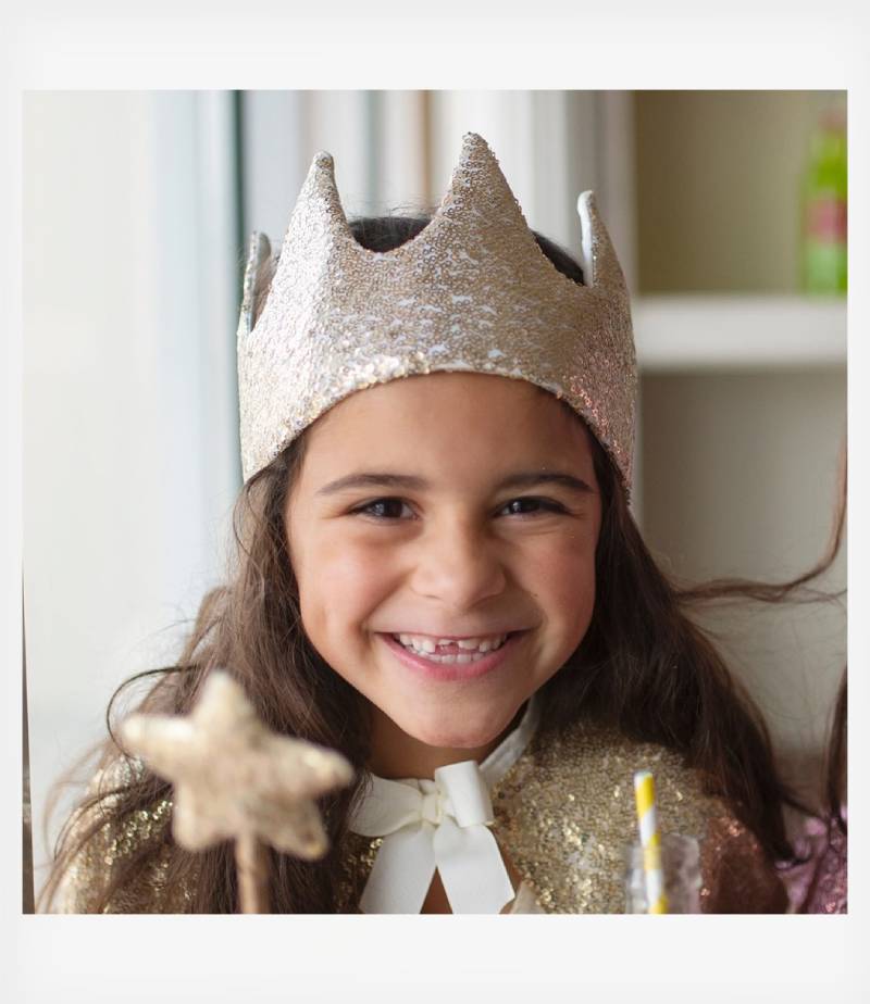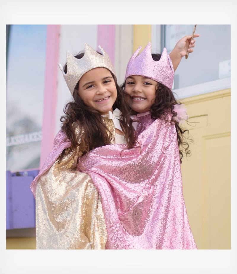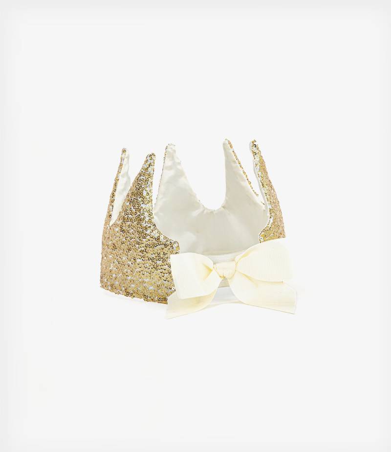 Υφασμάτινη κορόνα από την εταιρία Great Pretenders διακοσμημένη με αστραφτερές χρυσές πούλιες. Στο πίσω μέρος κουμπώνει με αυτοκόλλητο βέλκρο για μεγαλύτερη σταθερότητα και διαθέτει ένα υπέροχο ροζ φιόγκο, που ολοκληρώνει το αποτέλεσμα. Κατάλληλη από 3 ετών και άνω.
