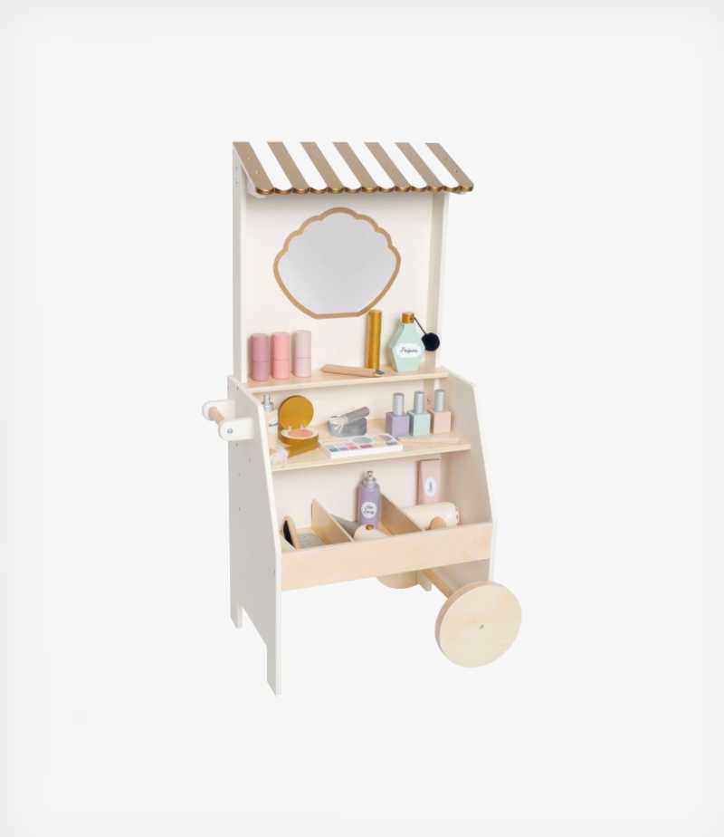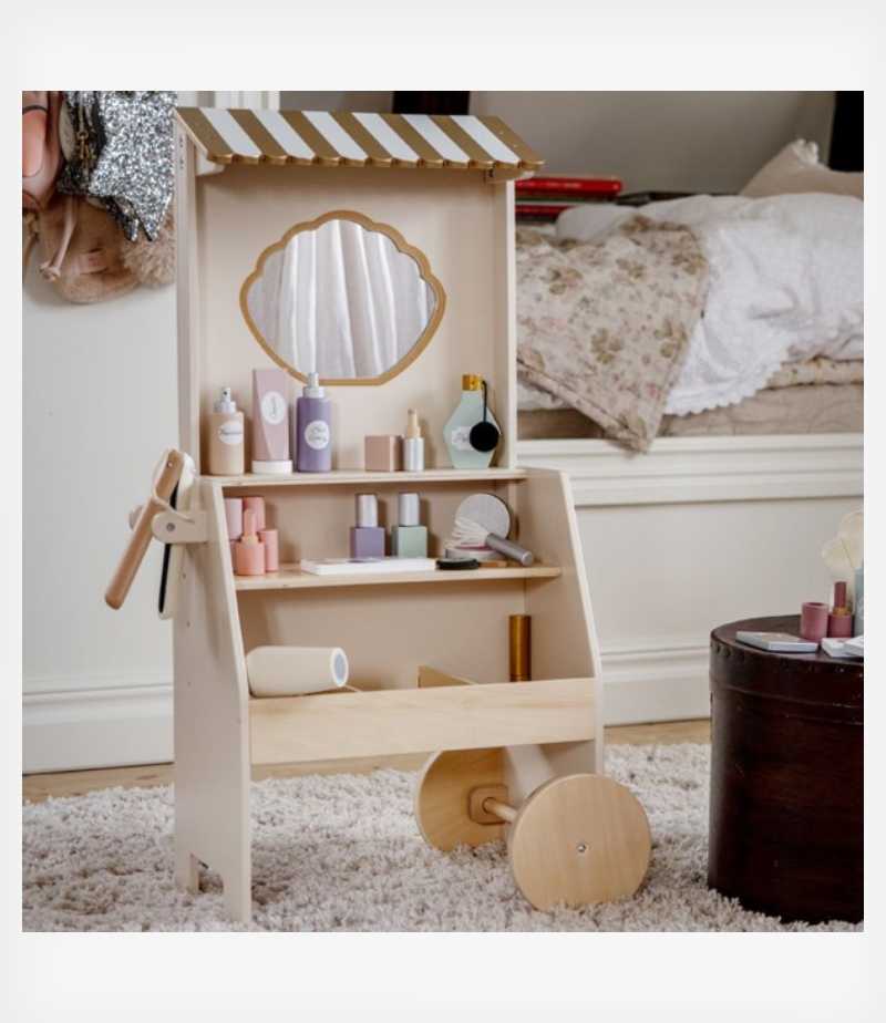 Όλα τα αξεσουάρ είναι κατασκευασμένα από ξύλο. Το σαλόνι ομορφιάς έχει ρόδες και χερούλια ώστε να μπορεί να μεταφερθεί εύκολα και υπάρχουν 2 ραφάκια για να μπορείτε να βάλετε τα προϊόντα σας. Ένα παιχνίδι που θα κρατήσει για ώρες απασχολημένο το παιδί.