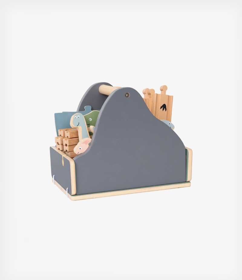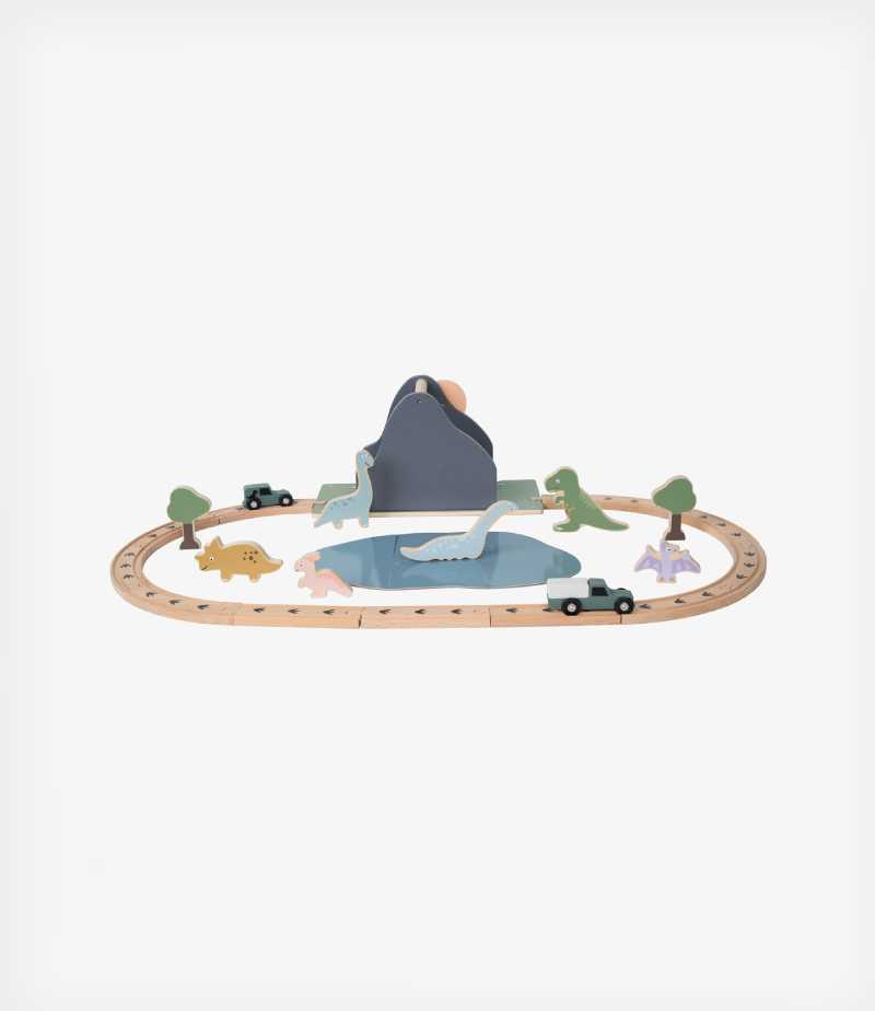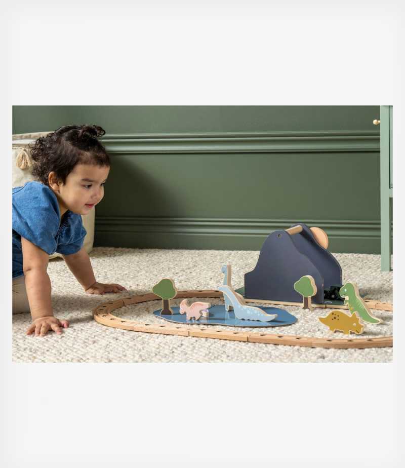 Ο ξύλινος σιδηρόδρομος της Jabadabado διαθέτει οχήματα, τρομερούς δεινόσαυρους και δεντράκια. Ενώστε τις ράγες μεταξύ τους και τοποθετείστε το βουνό κατά μήκος της ράγας.