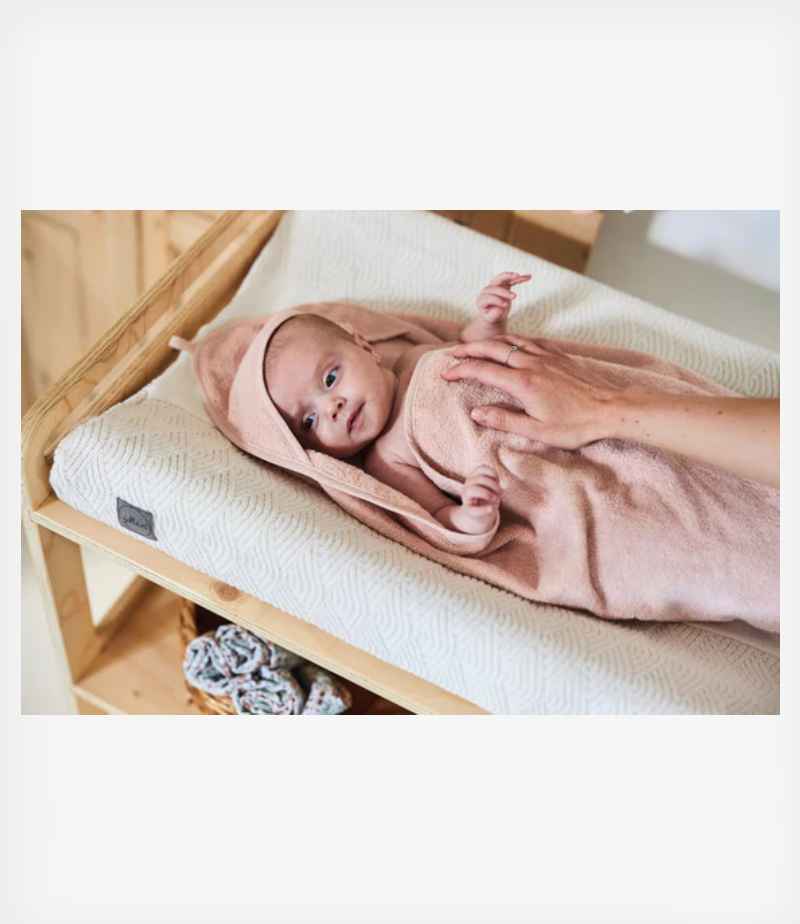 Το μαλακό πανί είναι απαλό στο ευαίσθητο δέρμα του μωρού και απορροφά καλά την υγρασία, ώστε να μπορείτε να το στεγνώσετε σε ελάχιστο χρόνο. Μετά τη χρήση, μπορείτε εύκολα να το κρεμάσετε από τη θηλιά στο εσωτερικό του λαιμού.