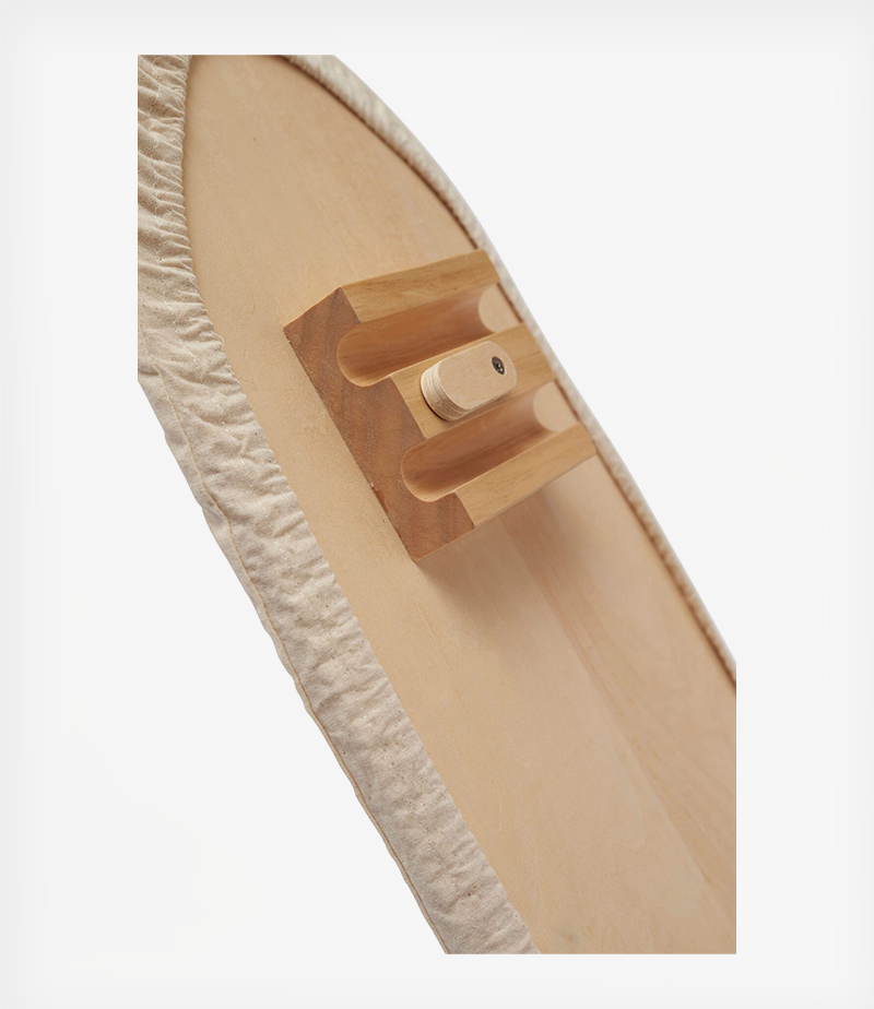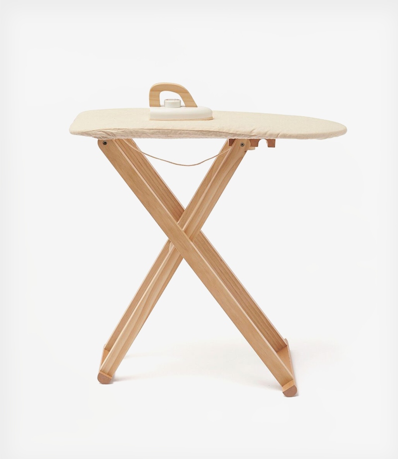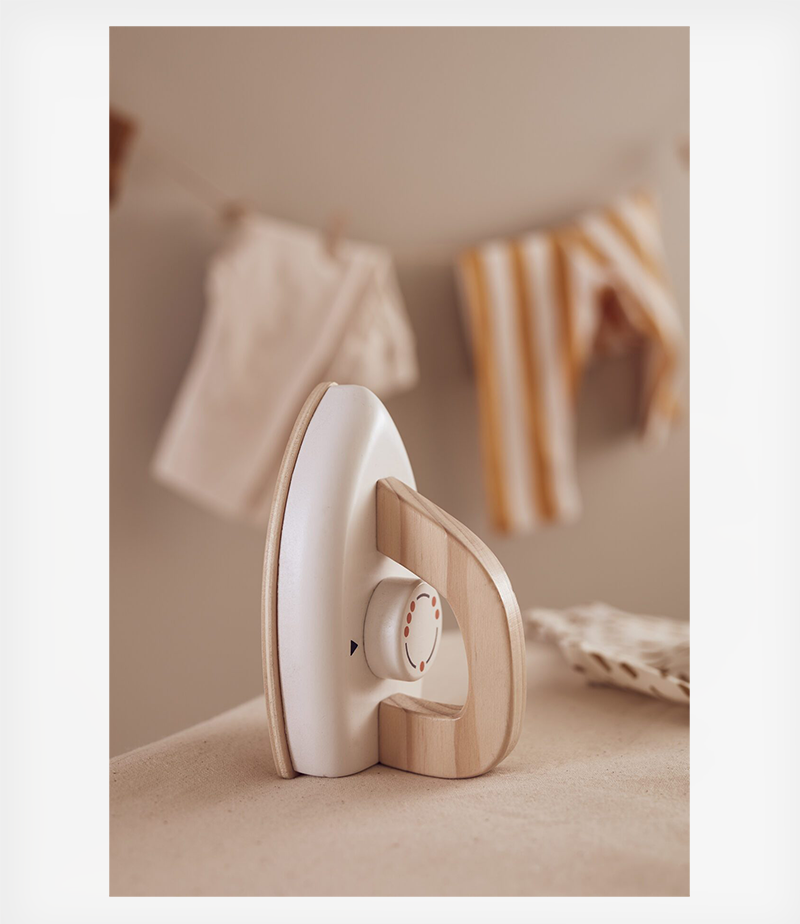 Ξύλινο σετ παιχνιδιού με σιδερώστρα και ασύρματο σίδερο. Η σιδερώστρα έχει ένα αφαιρούμενο βαμβακερό κάλυμμα. Το κουμπί στο σίδερο κάνει κλικ και μπορεί να περιστραφεί. Η σιδερώστρα είναι αναδιπλούμενη και εύκολη στην αποθήκευση όταν δεν τη χρησιμοποιείτε.