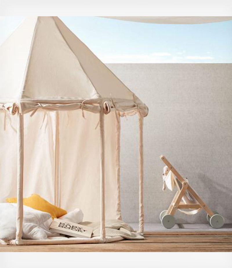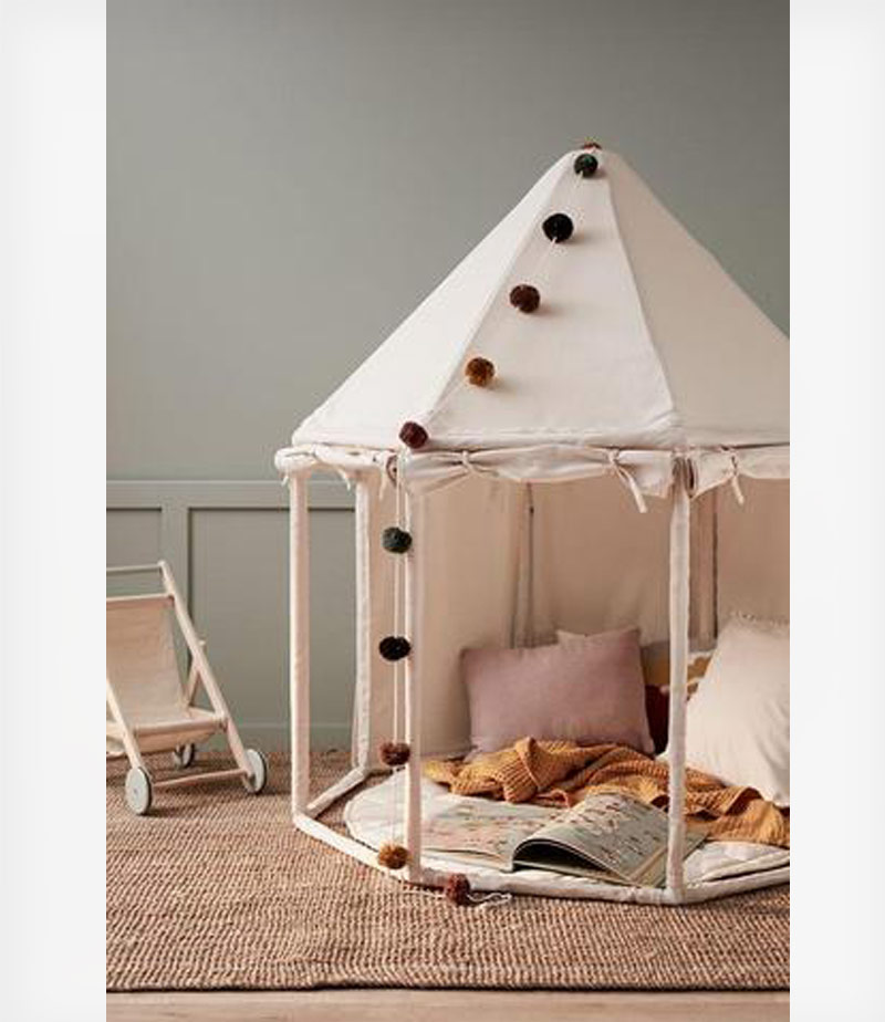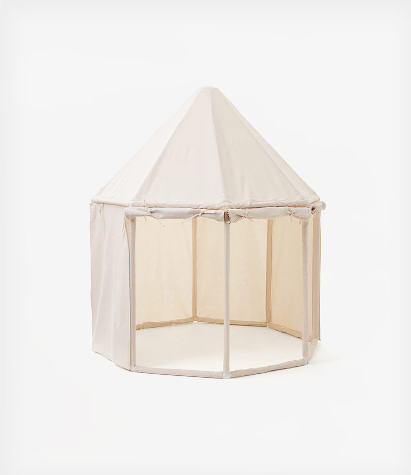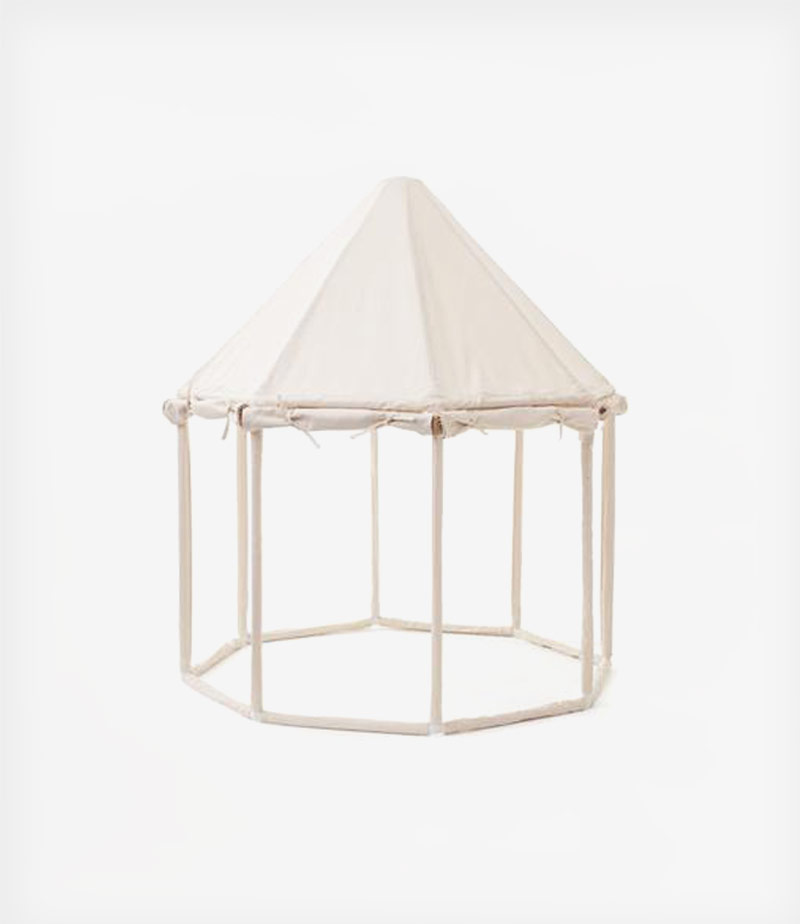 Ξύλινο σπιτάκι για άφθονο παιχνίδι με κάλυμμα σε εκρού χρώμα που κατεβαίνει πλευρικά από όλες τις πλευρές.