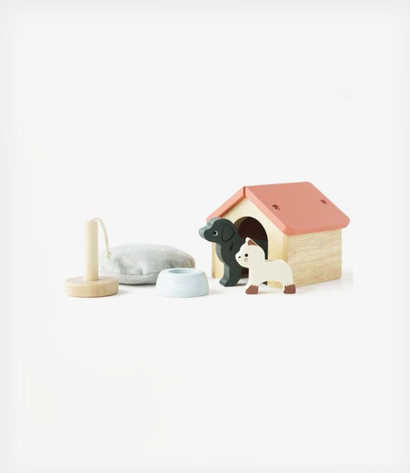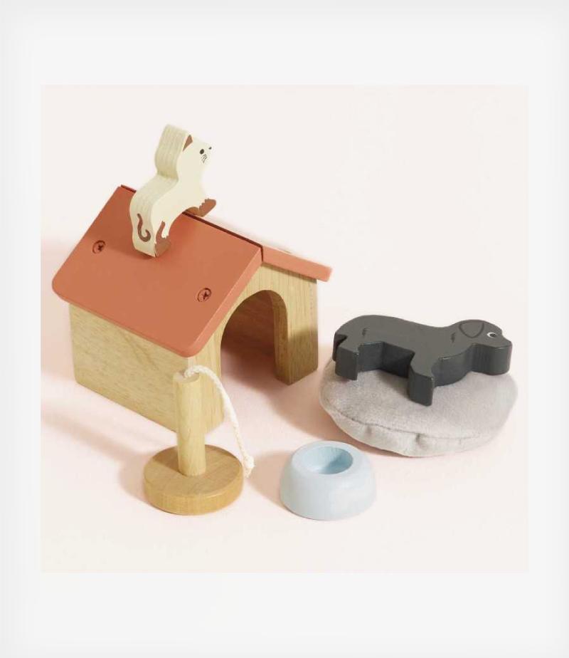 Ένα θαυμάσιο ξύλινο σετ κατοικιδίων που περιλαμβάνει ένα σκυλί, ένα σπιτάκι σκύλου, ένα μπολ σκυλιών, ένα κόκκαλο, μια γάτα, ένα ψάρι, ένα στρώμα γάτας και ένα μπολ γάτας.