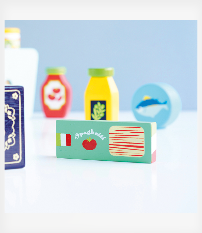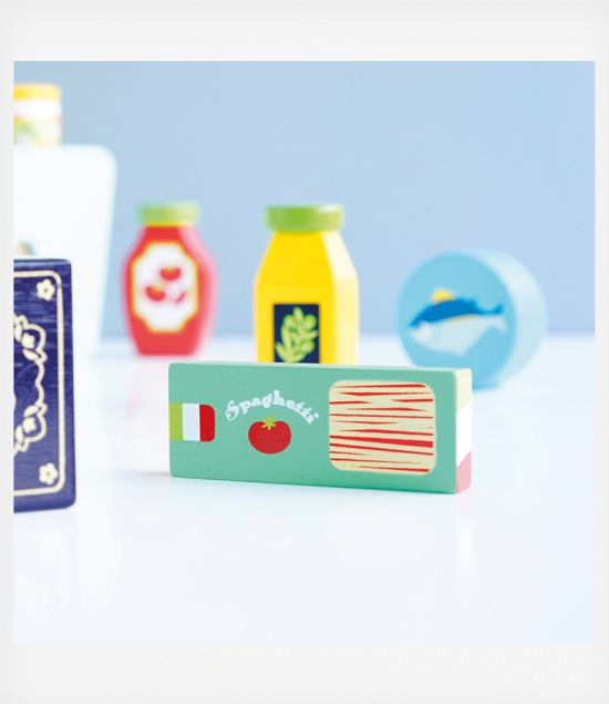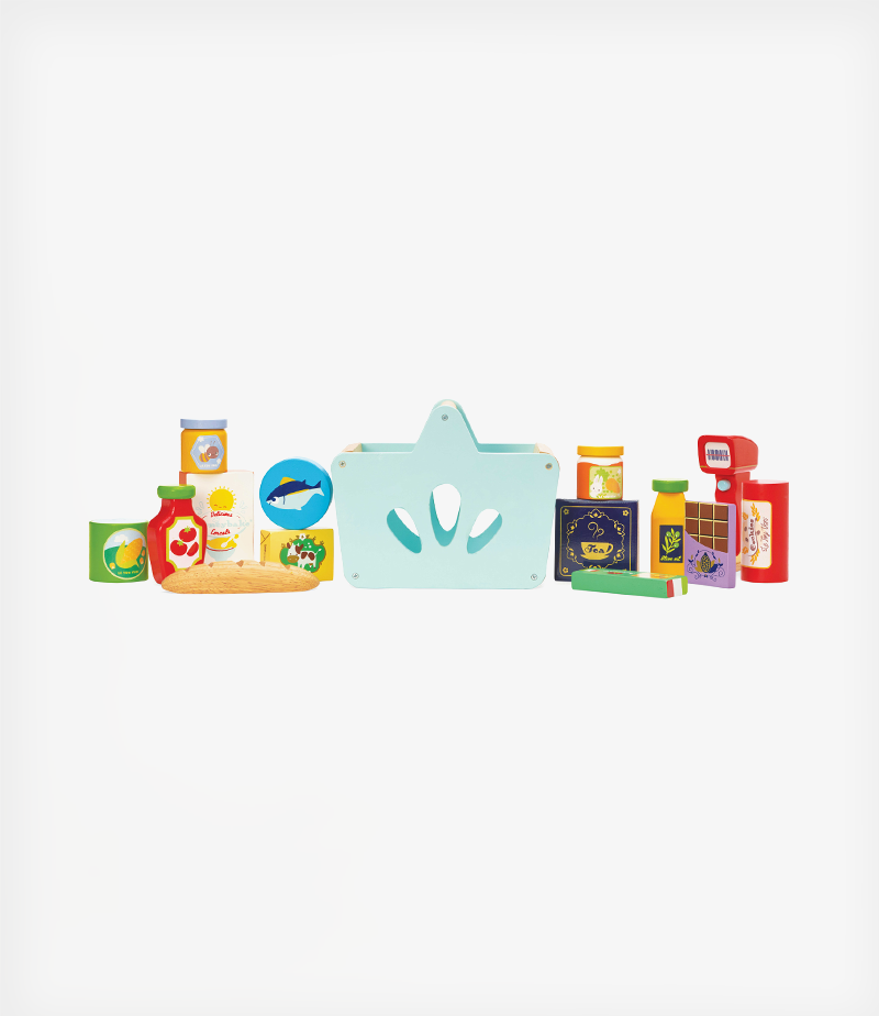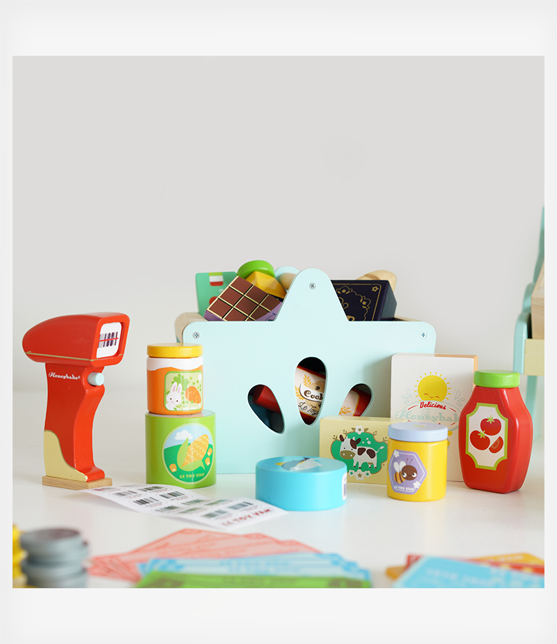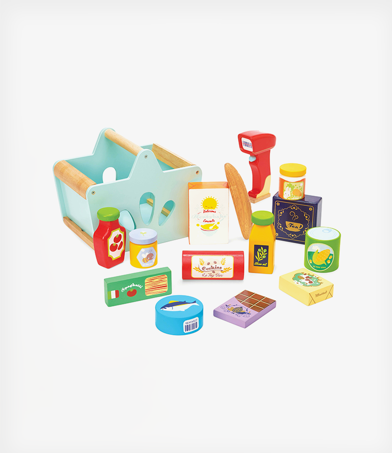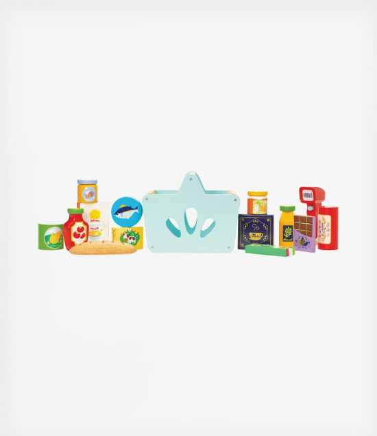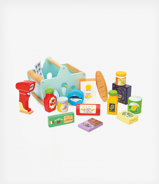 Το σετ περιλαμβάνει ένα ξύλινο καλάθι και περισσότερο από δώδεκα είδη παντοπωλείου από συμπαγές ξύλο καθώς και ένα σαρωτή barcode και μερικά αυτοκόλλητα barcode.