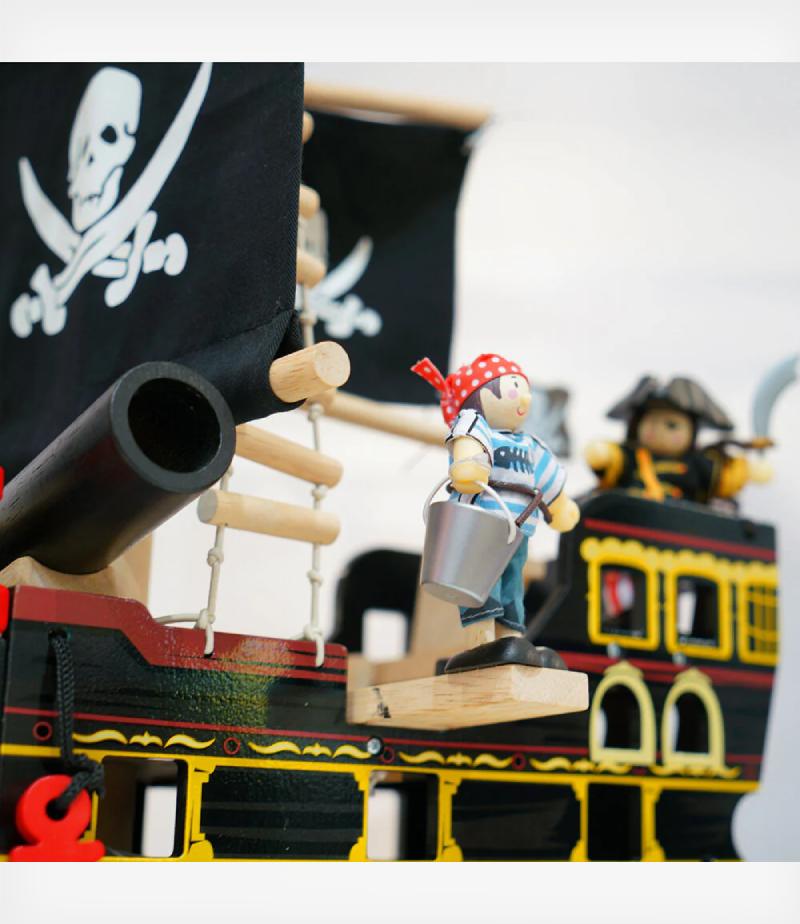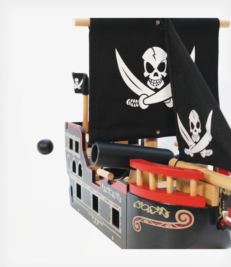 Βραβευμένο ξύλινο παιχνίδι, βαμμένο σε εντυπωσιακό μαύρο, με υφασμάτινα πανιά, διακοσμημένα με το κλασσικό πειρατικό σύμβολο που φωσφορίζει στο σκοτάδι!