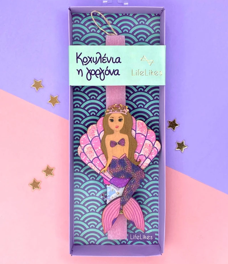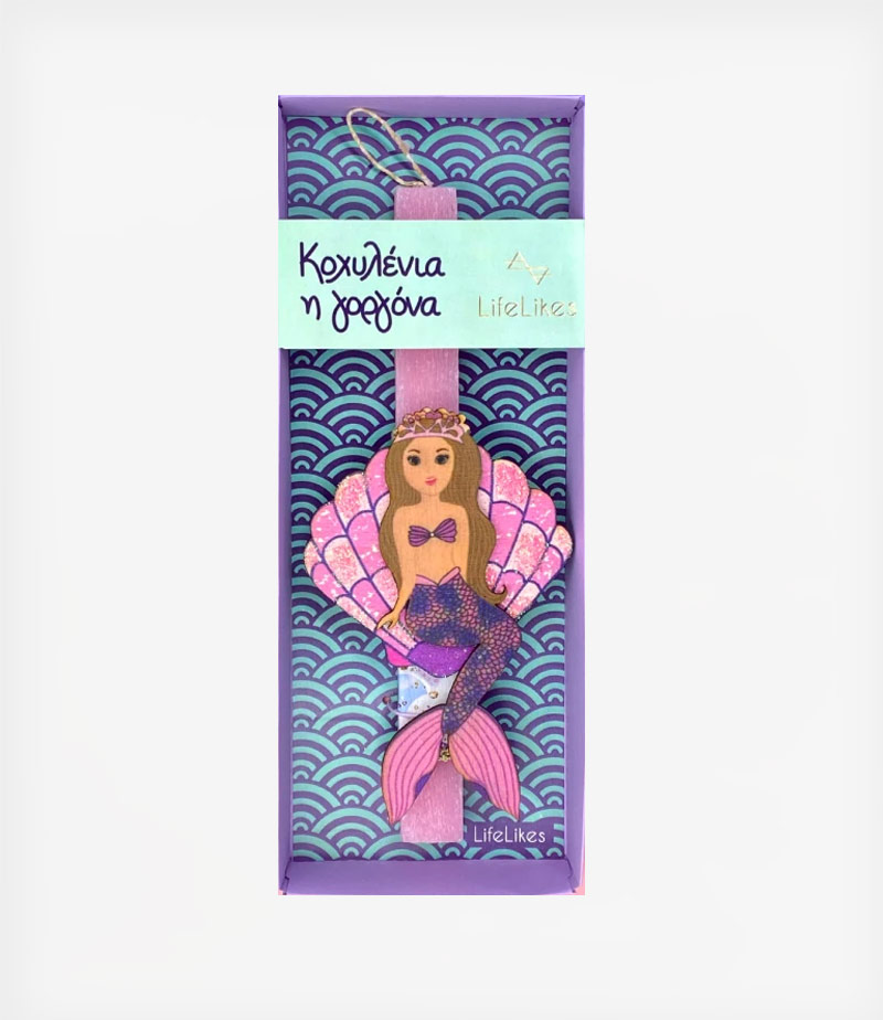 Για το αγαπημένο σου βαφτιστήρι που του αρέσουν οι γοργόνες, η Κοχυλένια η Γοργόνα, είναι η ιδανική λαμπάδα. Αποτελείται από ροζ κερί, με τη χαμογελαστή γοργόνα επάνω στο κοχύλι με τη χρυσόσκονη, να τη διακοσμεί, η οποία στη συνέχεια μπορεί να ξεκρεμαστεί και να κολληθεί οπουδήποτε επιθυμούν τα παιδιά, μιας και είναι μαγνητάκι. Η λαμπάδα “φιλοξενείται” μέσα σε υπέροχη συσκευασία δώρου, έτοιμη να τη δωρίσεις στα αγαπημένα σου βαφτιστήρια. Και στο πίσω μέρος της λαμπάδας, ένα μικρό ποιημάτακι, για όλα τα κορίτσια: