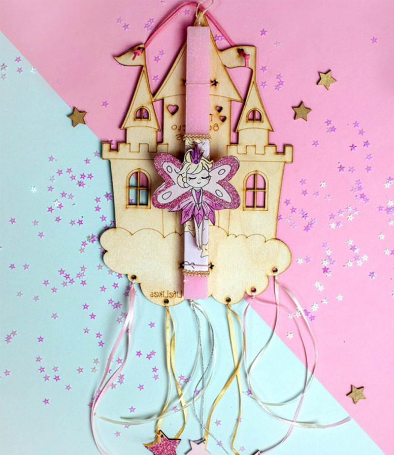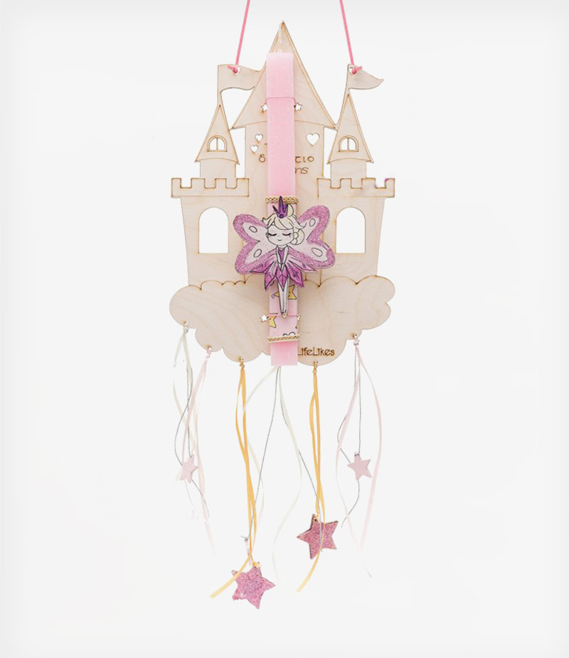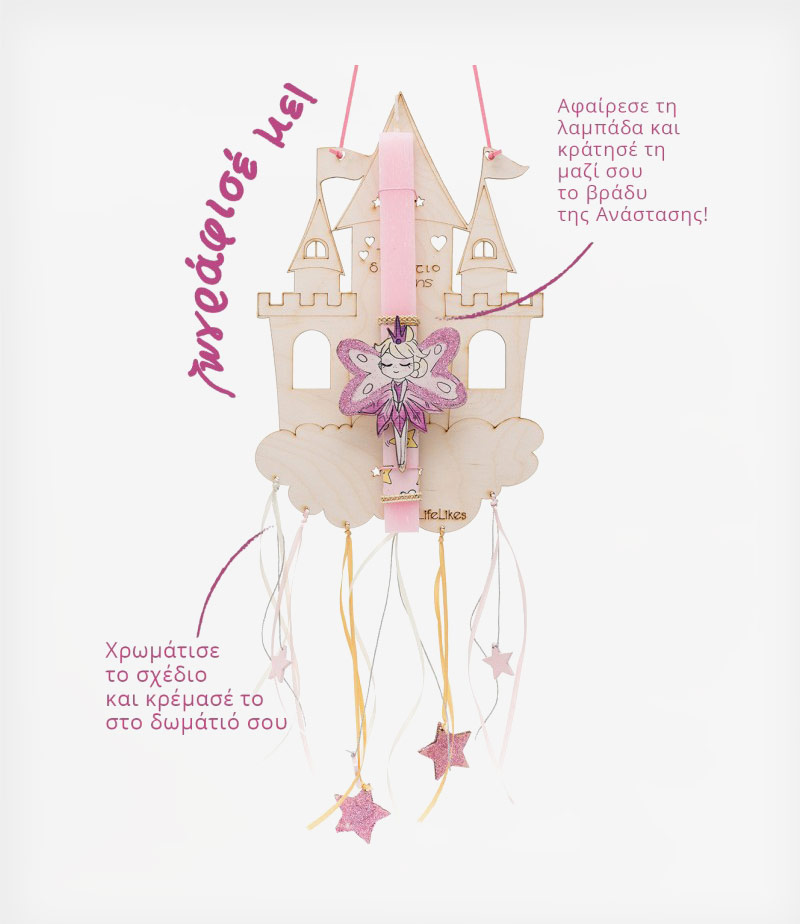 Σε τέλεια ροζ απόχρωση, με χειροποίητα σχέδια σε παστέλ αποχρώσεις, είναι σίγουρο ότι θα ενθουσιάσει τη μικρή σας φίλη! Η λαμπάδα «φιλοξενείται» επάνω σε ένα ξύλινο κάδρο με παιχνιδιάρικες, χρωματιστές κορδέλες που στη συνέχεια μπορεί να το ζωγραφίσει, να γράψει το όνομά της και να το κρεμάσει στον τοίχο.