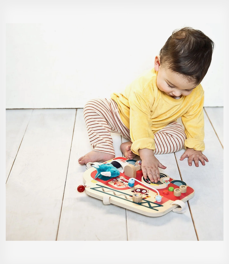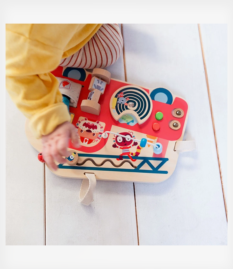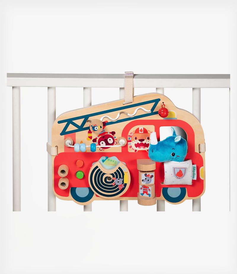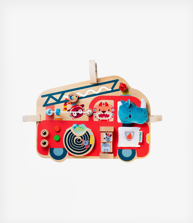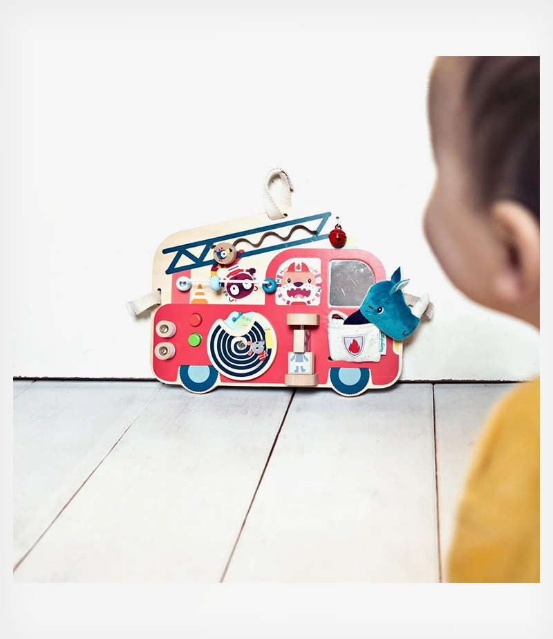 Ξύλινος πίνακας δραστηριοτήτων από τη Lilliputiens, που απεικονίζει ένα πυροσβεστικό όχημα. Προσφέρει αμέτρητες δραστηριότητες και προσαρμόζεται εύκολα στο πάρκο χάρη στις ταινίες velcro.