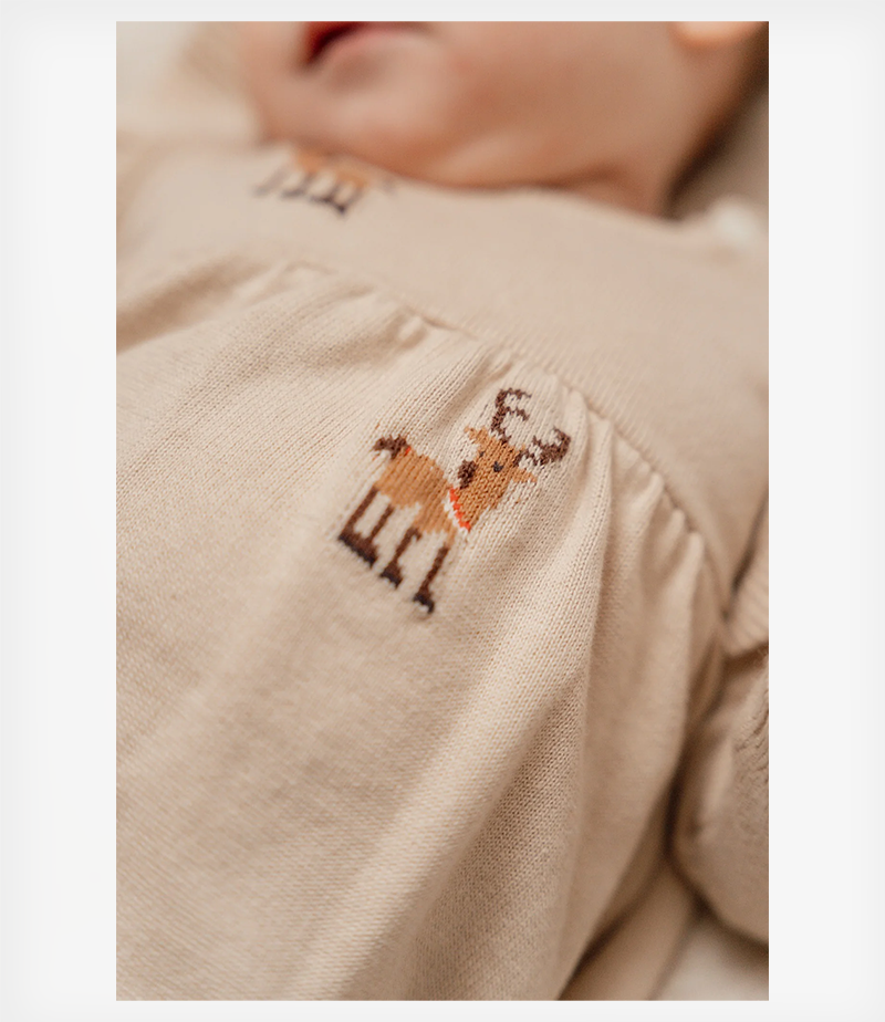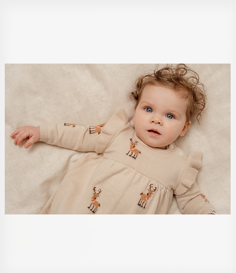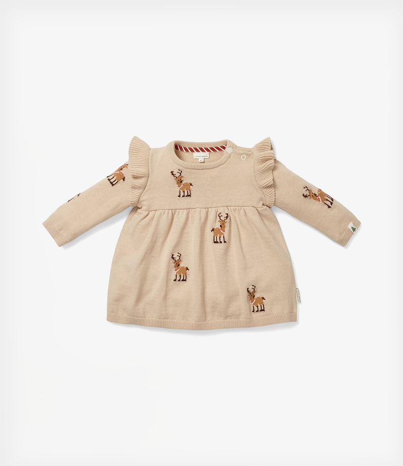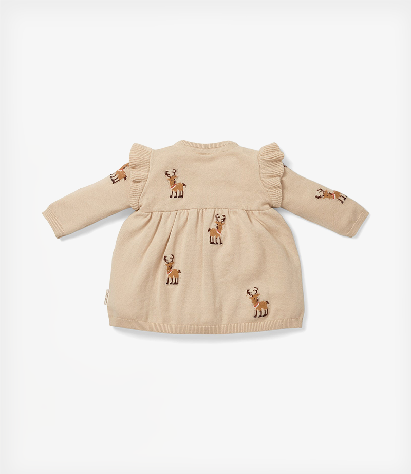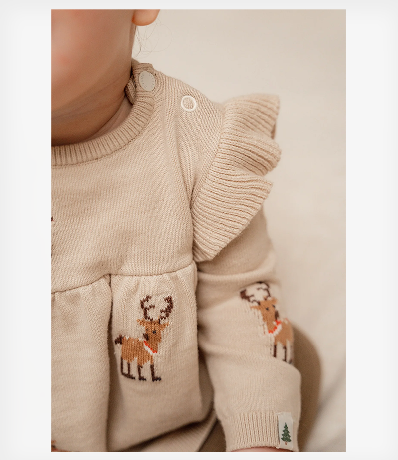 Αυτό το άνετο και μαλακό πλεκτό φόρεμα που καλύπτεται από υπέροχους ταράνδους είναι τέλειο για τις ημέρες των γιορτών. Διαθέτει μακριά μανίκια με κομψές λεπτομέρειες με βολάν που το κάνουν ακόμη πιο όμορφο.