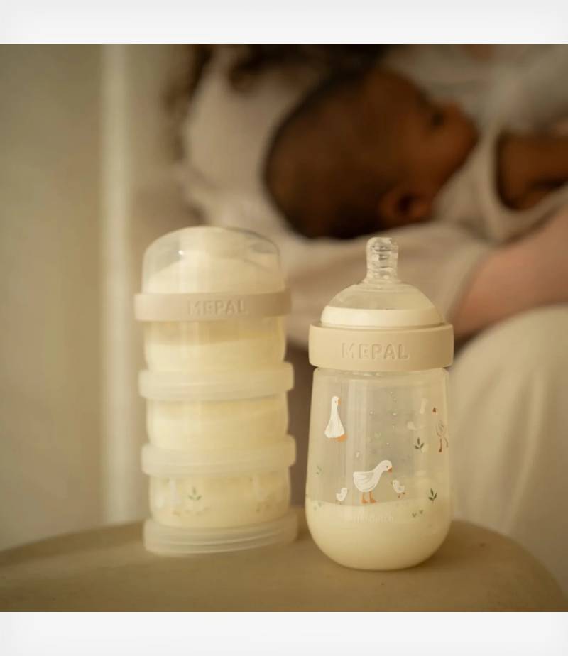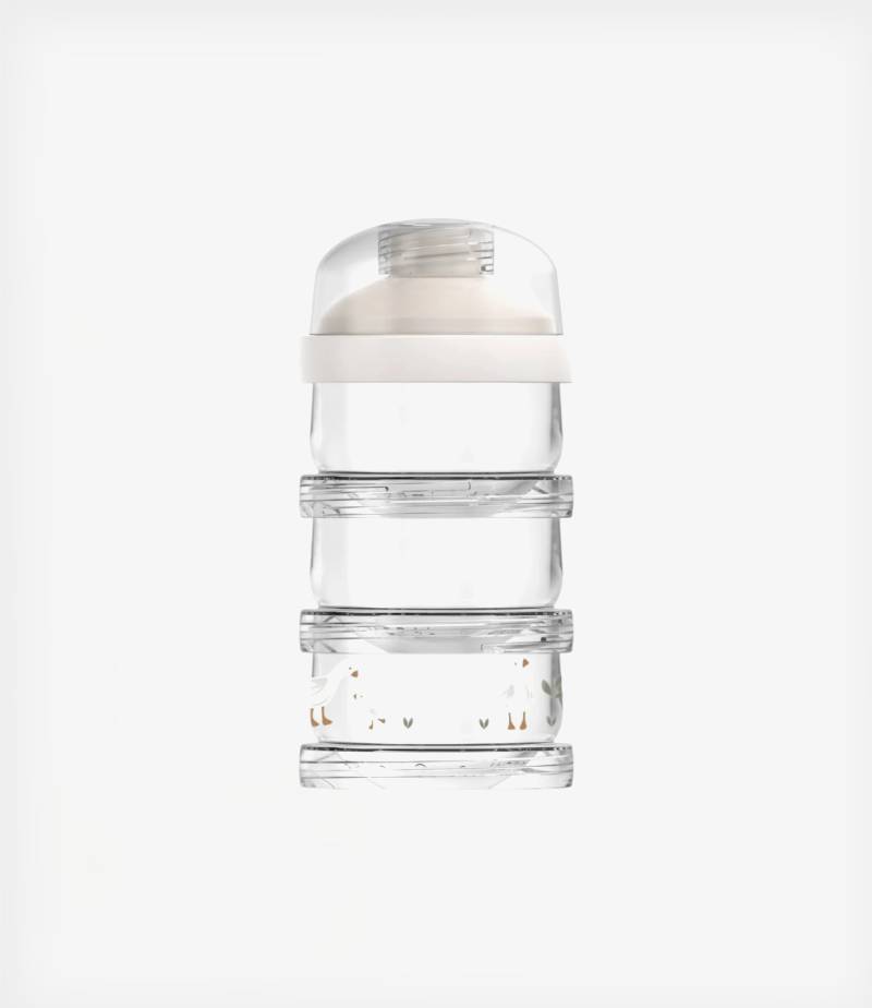 Με παιχνιδιάρικο σχεδιασμό, προσφέρει ασφαλή, υγιεινή και πρακτική αποθήκευση της σκόνης γάλακτος. Οι τρεις στοιβαζόμενες θήκες διαθέτουν ξεχωριστά, βιδωτά καπάκια και πρακτικό στόμιο ροής για εύκολη μεταφορά στο μπιμπερό – χωρίς διαρροές και ακαταστασία.