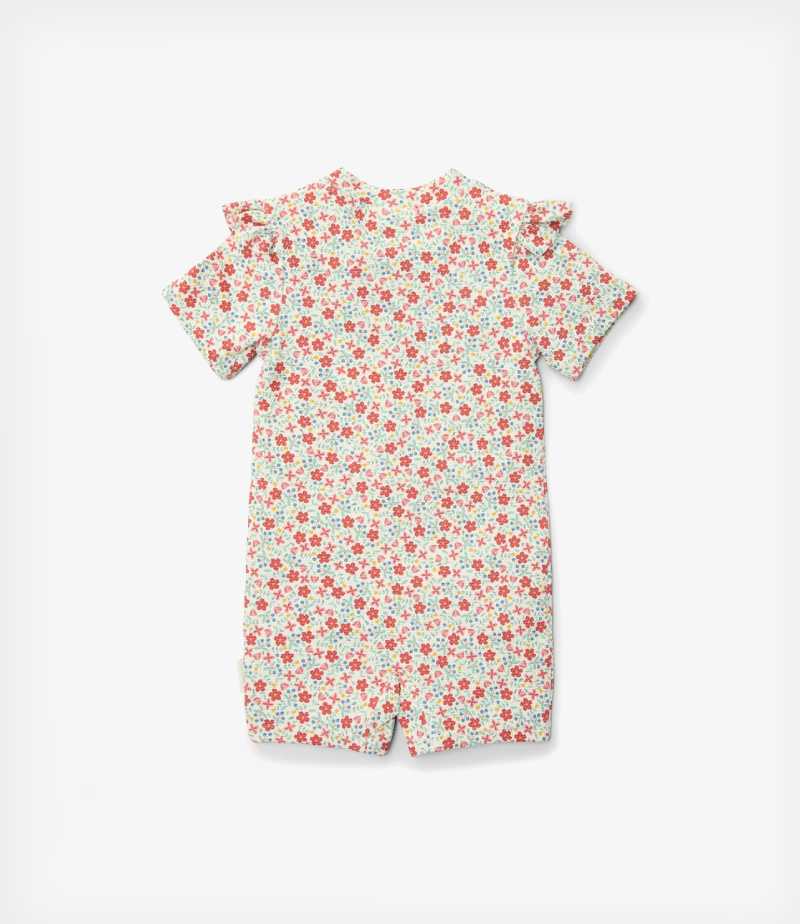 Αυτό το χαριτωμένο ολόσωμο μαγιό είναι ιδανικό για βουτιές και εξερεύνηση στην άμμο. Τα βολάν στους ώμους θυμίζουν τους κυματισμούς της θάλασσας, ενώ το μπροστινό φερμουάρ διευκολύνει το ντύσιμο, ακόμα και όταν το μικρό σας είναι βρεγμένο.