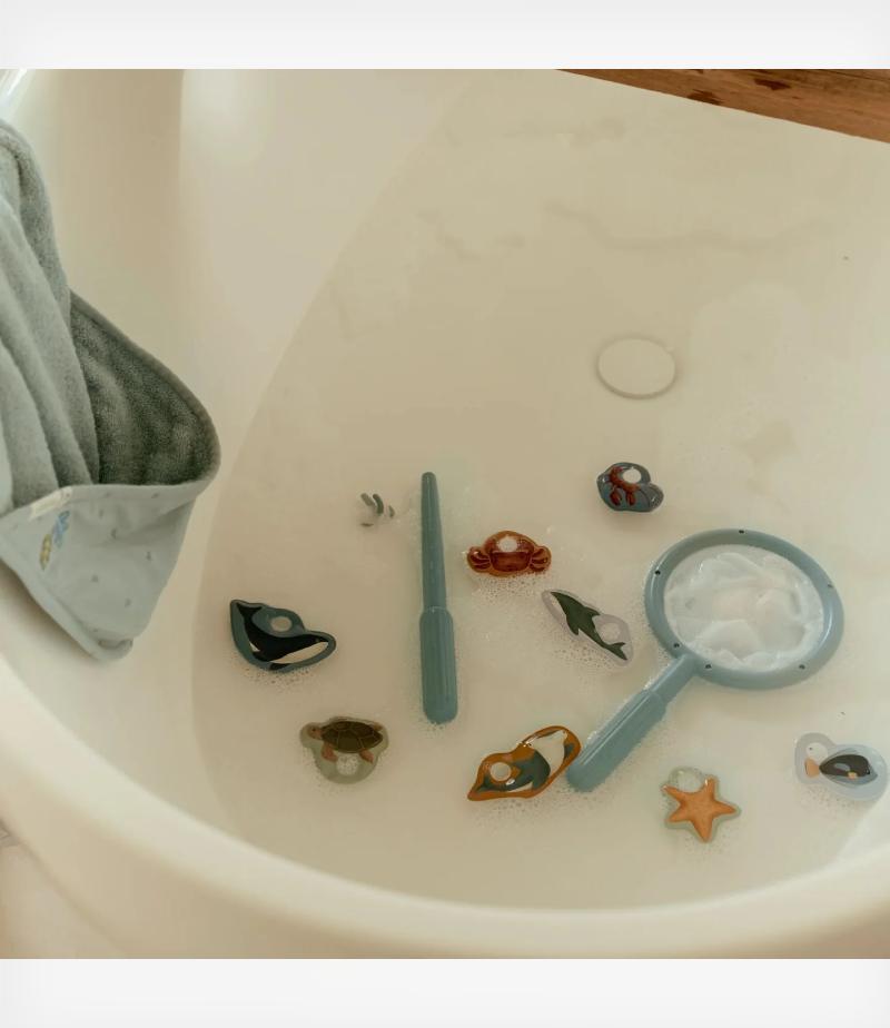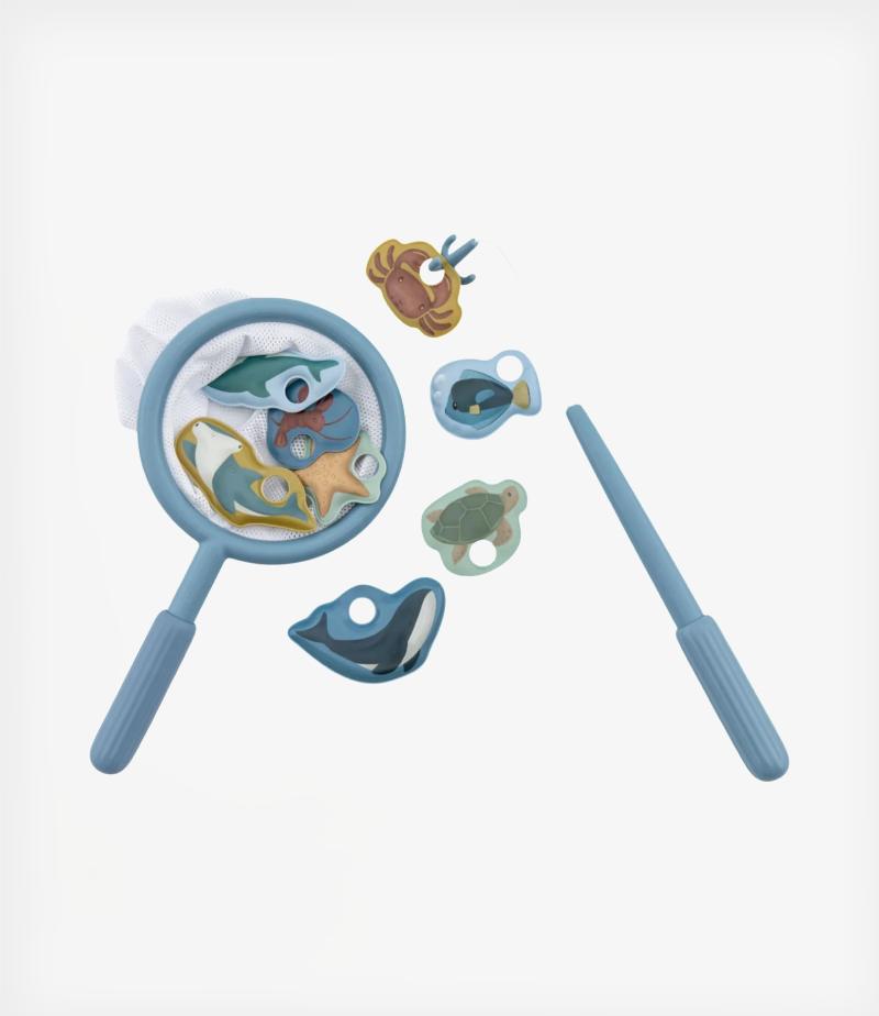 Το σετ περιλαμβάνει ένα καλάμι ψαρέματος, μια απόχη και 8 χαριτωμένα θαλάσσια ζωάκια που περιμένουν να τα πιάσουν.
