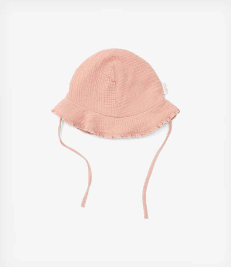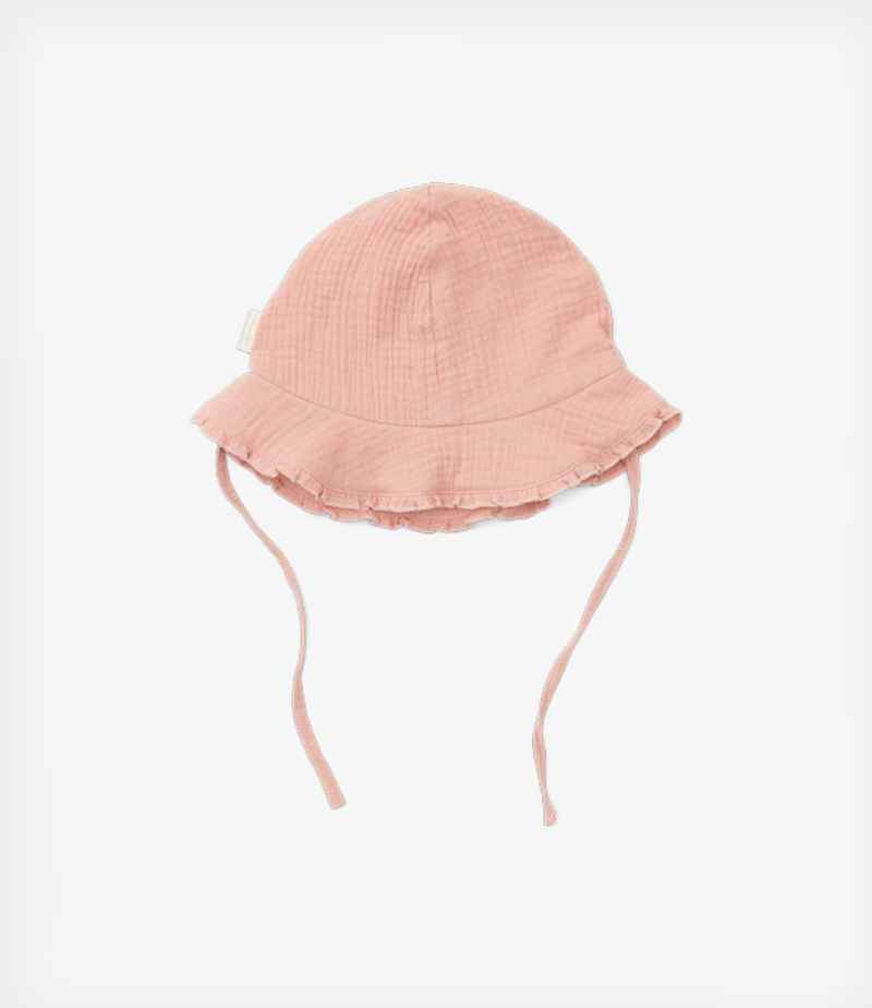 Αυτό το μαλακό και ελαφρύ καπέλο από μουσελίνα κατασκευασμένο από βιολογικό βαμβάκι διαθέτει δύο κορδονάκια για να το στερεώσετε στο κεφαλάκι του μικρού σας.