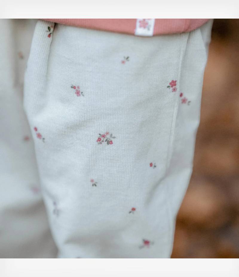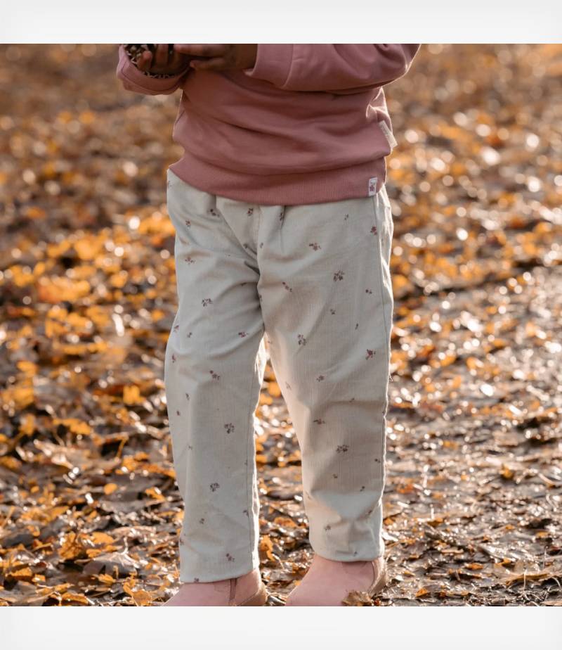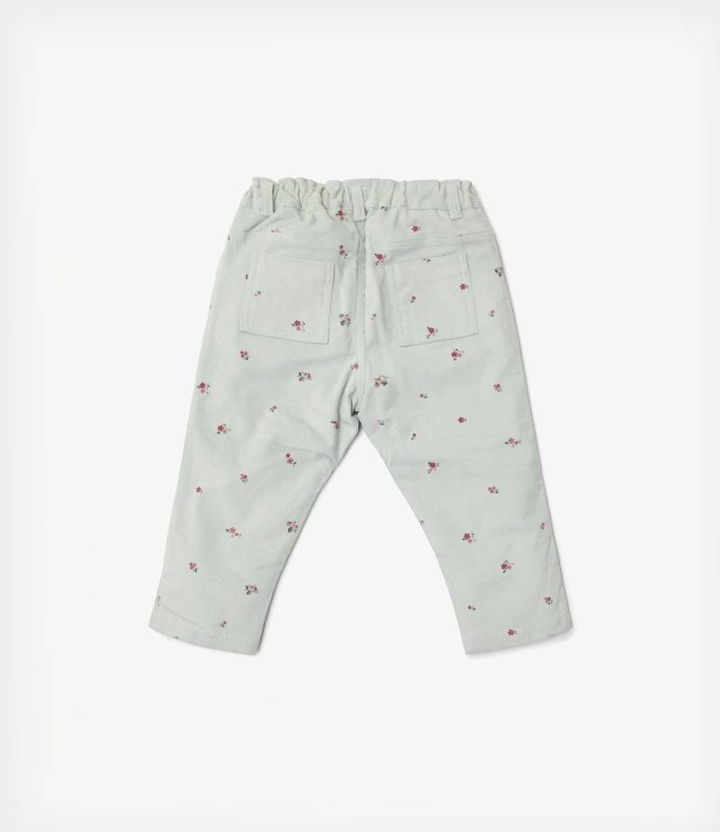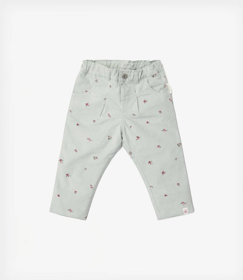 Αυτό το υπέροχο παντελόνι σε απαλό πράσινο κοτλέ με παιχνιδιάρικο φλοράλ σχέδιο συνδυάζει στυλ, άνεση και οικολογική συνείδηση.
