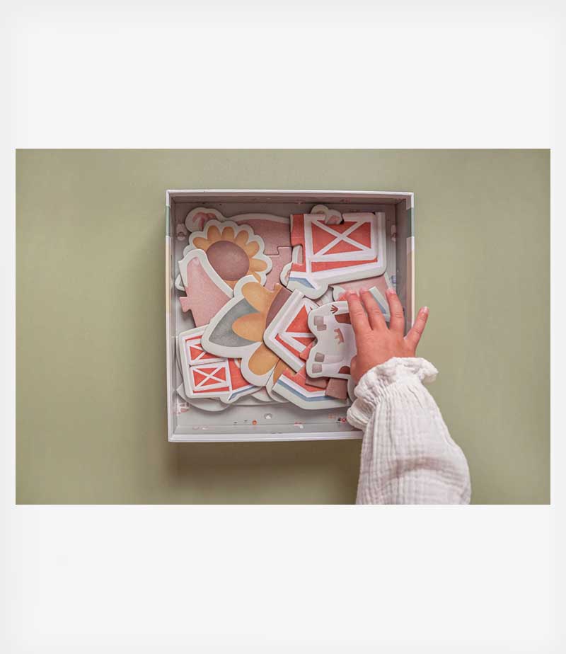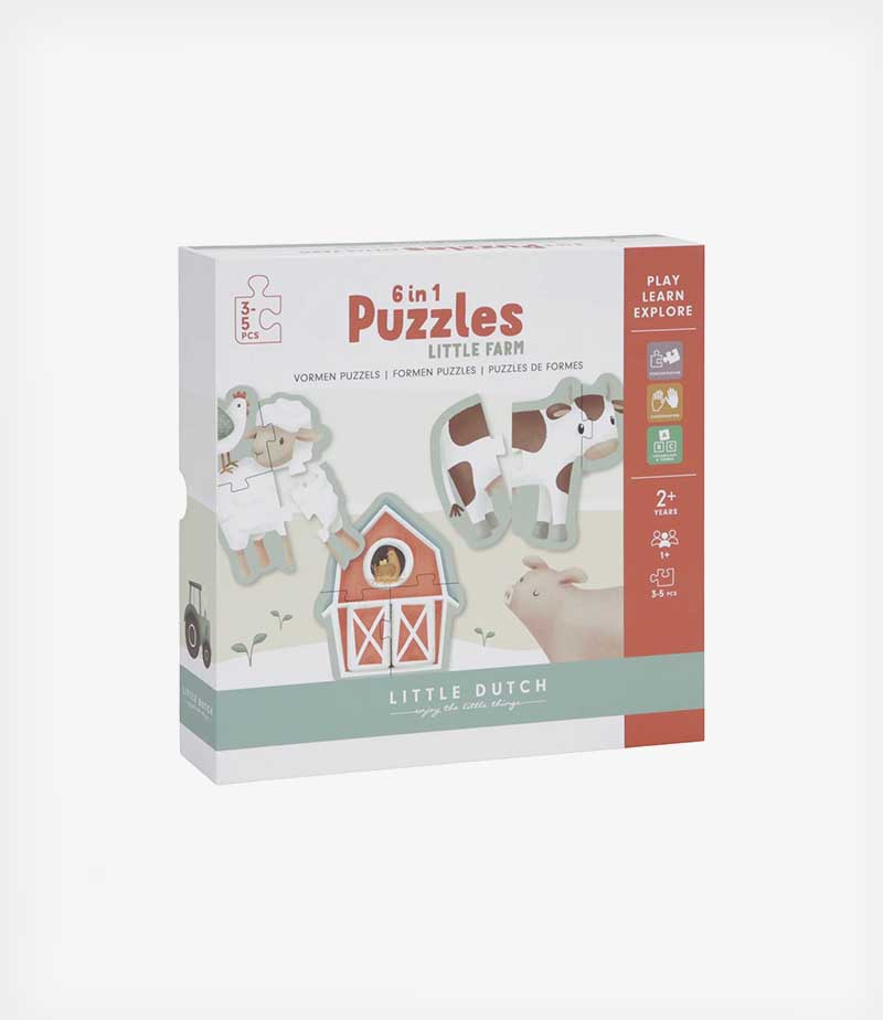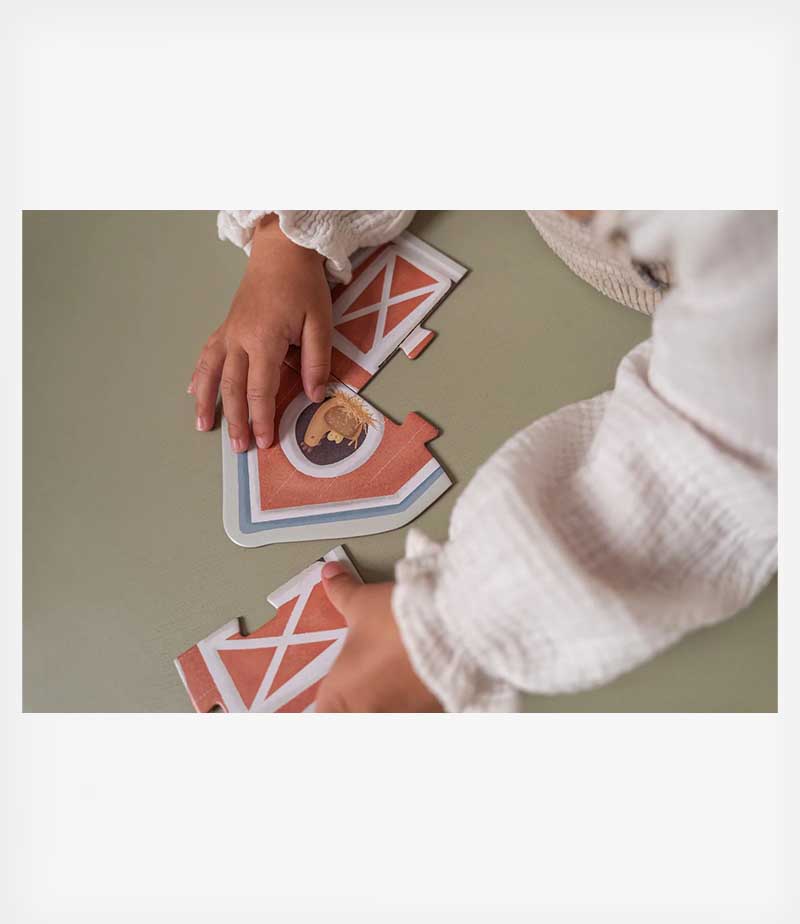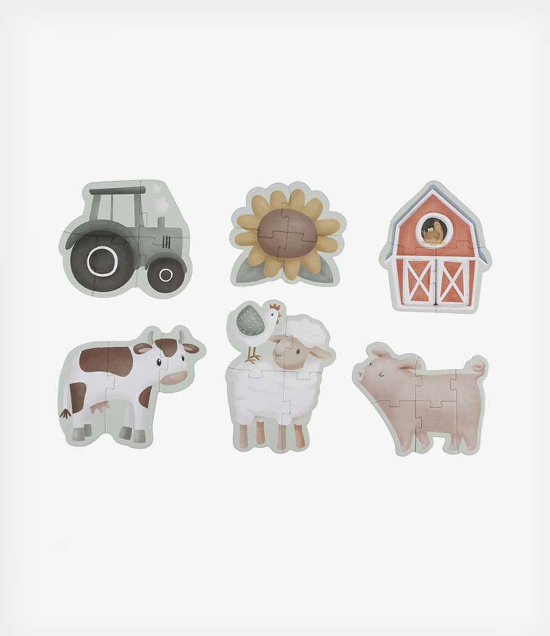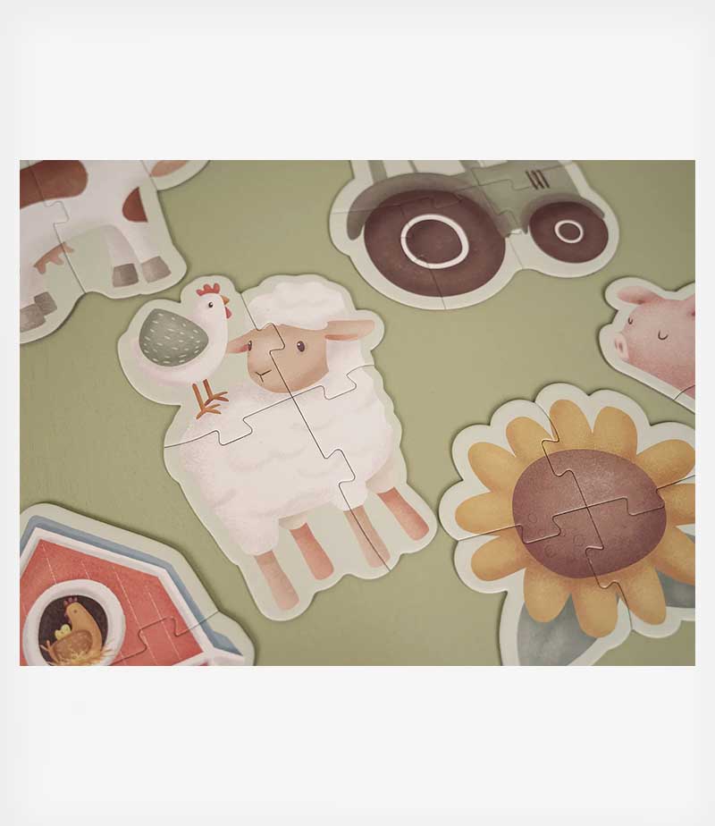 Κάθε παζλ είναι όμορφα εικονογραφημένο με θέμα τη ζωή στη φάρμα και περιέχει 3, 4 ή 5 κομμάτια. Κατασκευασμένο από στιβαρό χαρτόνι, κάθε κομμάτι έχει το τέλειο σχήμα και μέγεθος για μικρά χεράκια.