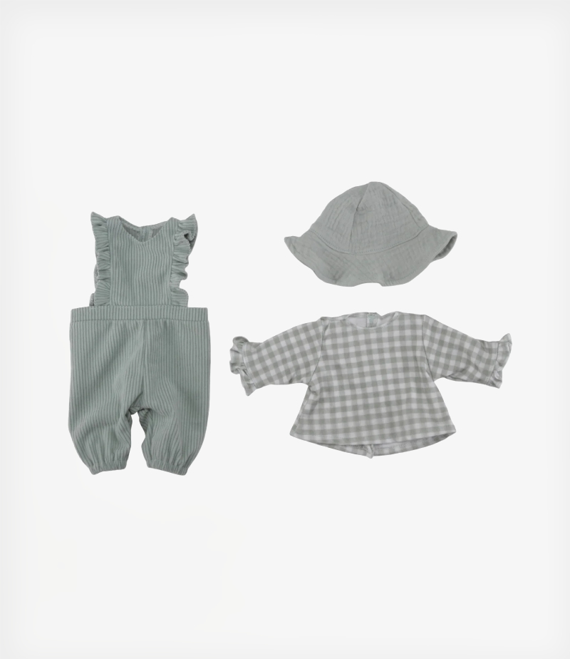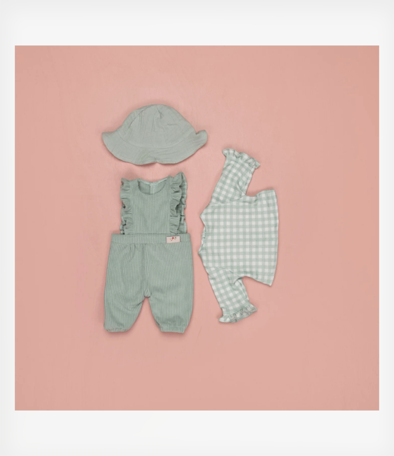 Το σετ περιλαμβάνει μια ολόσωμη φόρμα με βολάν σε απαλή πράσινη απόχρωση και ένα μακρυμάνικο μπλουζάκι με καρό λευκό και πράσινο σχέδιο. Για να ολοκληρωθεί αυτό το υπέροχο σύνολο, το σετ περιλαμβάνει ένα χαριτωμένο μαλακό πράσινο καπέλο για τον ήλιο.
