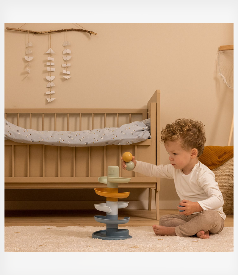 Ο πύργος συνοδεύεται από τρεις μεγάλες μπάλες, ιδανικές για τα χεράκια του μικρού σας, σε διαφορετικά χρώματα που κάνουν ήχο κατά την κίνηση.