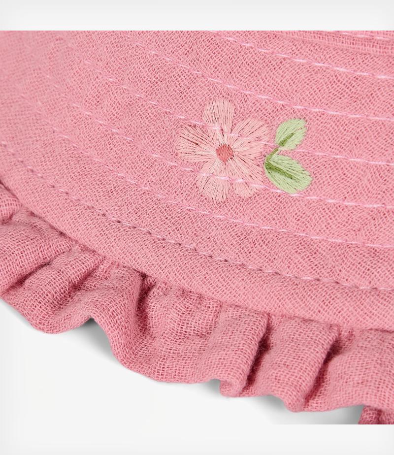 Κατασκευασμένο από απαλό ύφασμα, είναι ελαφρύ και άνετο, ενώ το λεπτό κεντημένο λουλουδάκι στο γείσο προσθέτει μια παιχνιδιάρικη και γλυκιά λεπτομέρεια. Τα μαλακά κορδονάκια δένουν άνετα και κρατούν το καπέλο στη θέση του, κάτι που το κάνει ιδανικό για παιχνίδι ή βόλτα στον ήλιο.