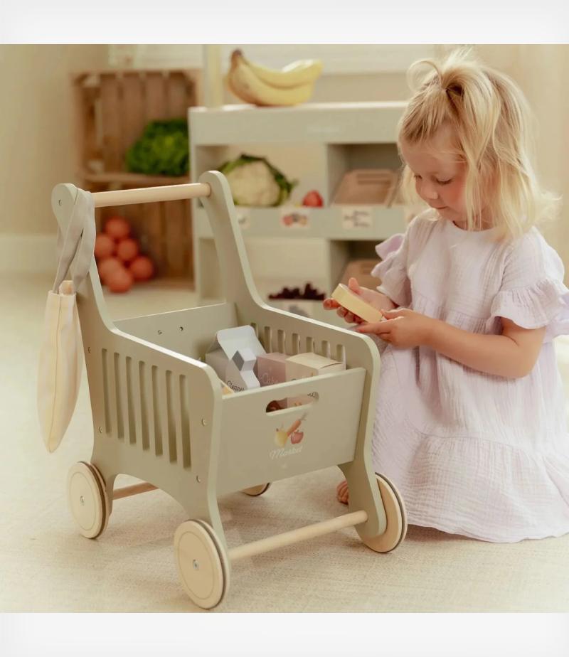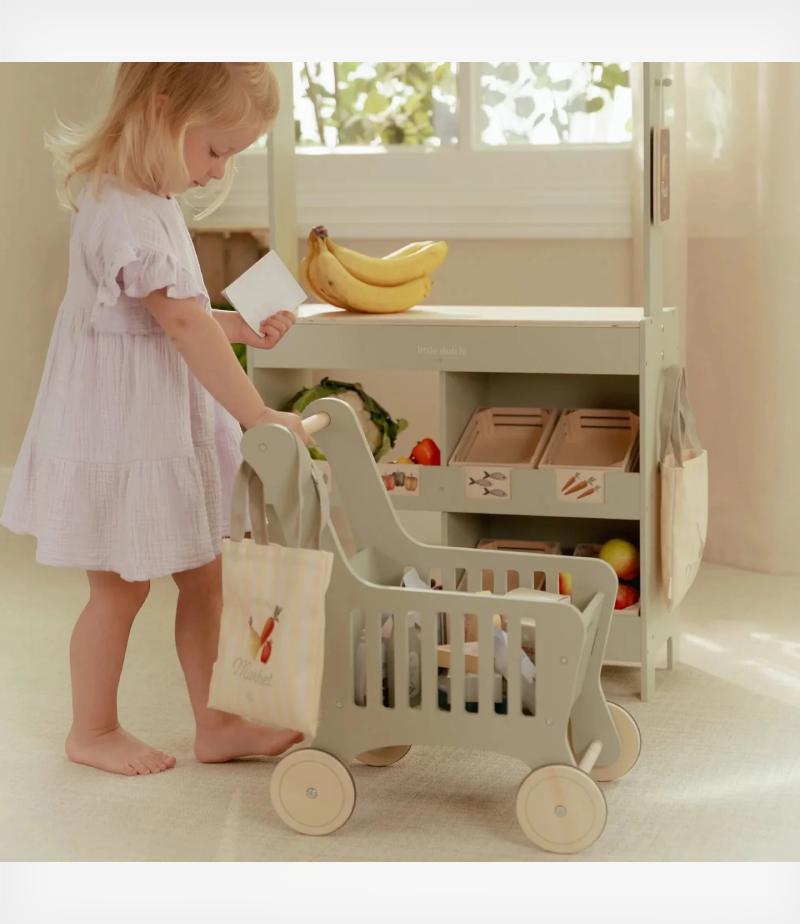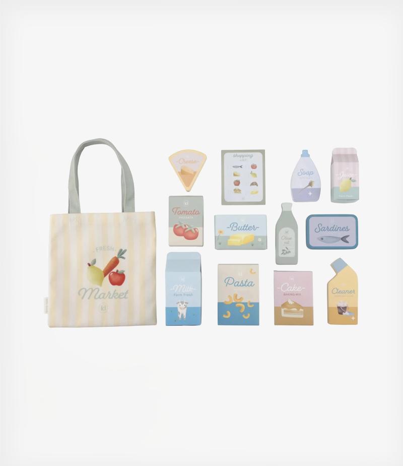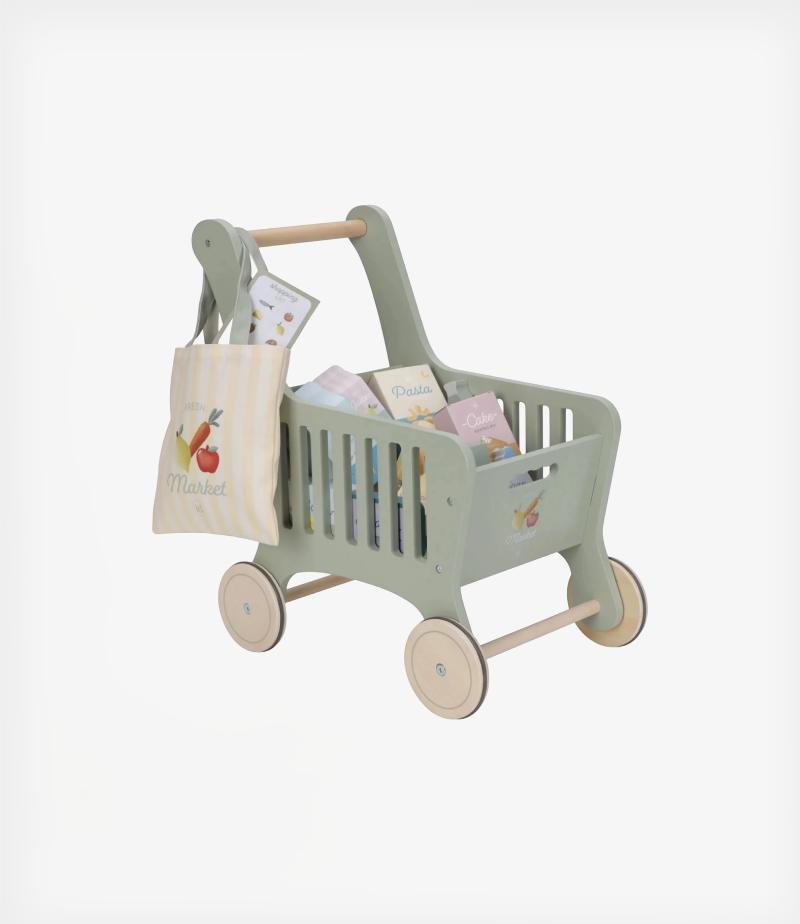 Το σετ περιλαμβάνει διάφορα προϊόντα και μια πρακτική τσάντα αγορών, για παιχνίδι από την πρώτη στιγμή. Με μια χαρούμενη εικονογράφηση στο μπροστινό μέρος, το καρότσι κάνει το παιχνίδι ακόμη πιο διασκεδαστικό.