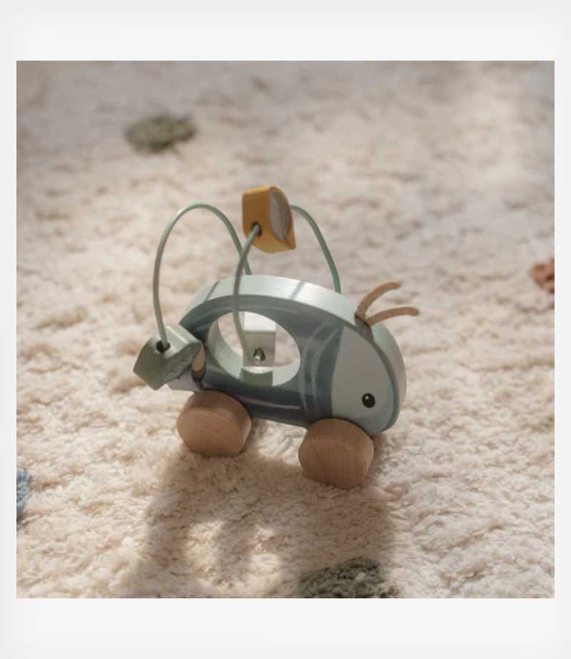 Στο εσωτερικό του, θα ανακαλύψετε μια χαριτωμένη κουδουνίστρα, ιδανική για να την πιάνουν και να την κουνάνε τα μικροσκοπικά χεράκια. Υπάρχει επίσης ένα αξιολάτρευτο παιχνίδι ταξινόμησης που επιτρέπει στο μικρό σας να φτιάξει ένα ευφάνταστο μανιτάρι. Και για να συμπληρωθεί το τρίο, ένα κυλιόμενο σκαθάρι που στολίζεται με ένα μανιτάρι, βελανίδια και φύλλα, κινείται με χάρη κατά μήκος της σπείρας στην πλάτη του.