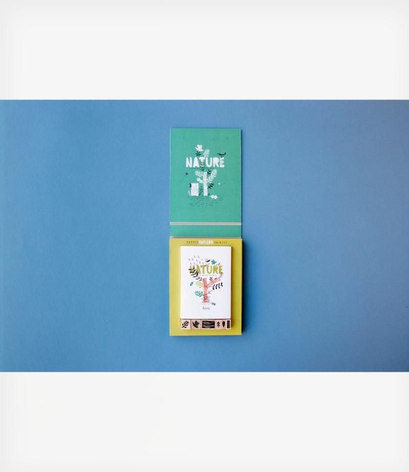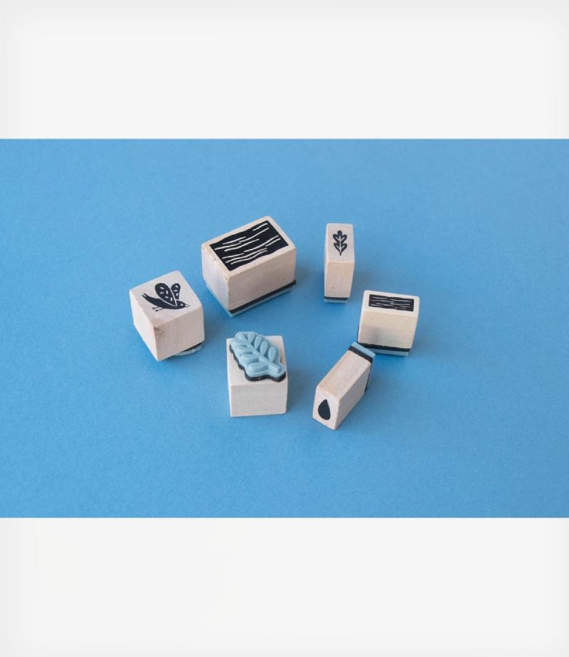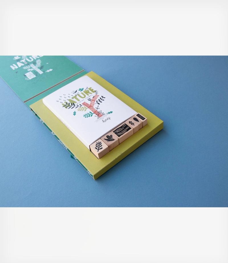 Η συσκευασία περιλαμβάνει 9 αναδιπλούμενα φύλλα, 6 ξύλινες στάμπες και 3 διαφορετικά χρώματα μελάνι (κόκκινο, πράσινο και πορτοκαλί).
