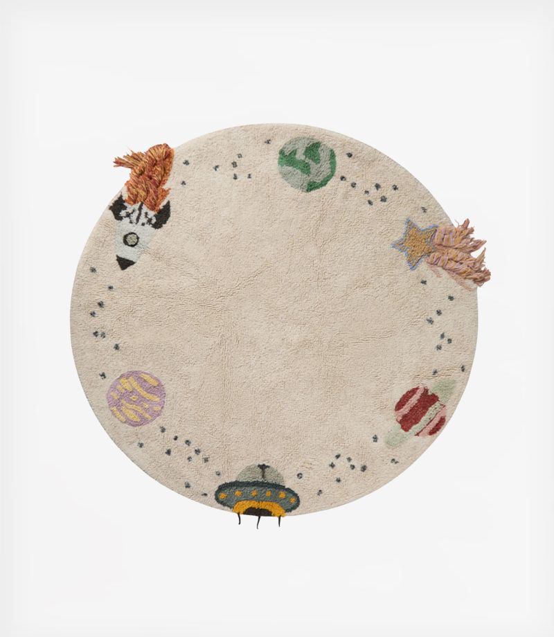 Σε απαλό φυσικό χρώμα, το χαλί αυτό διαθέτει παιχνιδιάρικα σχέδια με τρεις πλανήτες, έναν πύραυλο με μακριές φλόγες από κλωστές, ένα αστέρι με υφασμάτινη ουρά και ένα διαστημόπλοιο με κορδόνια για πόδια.