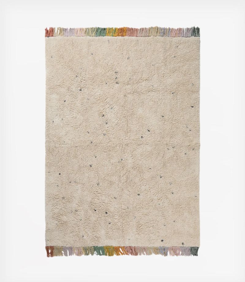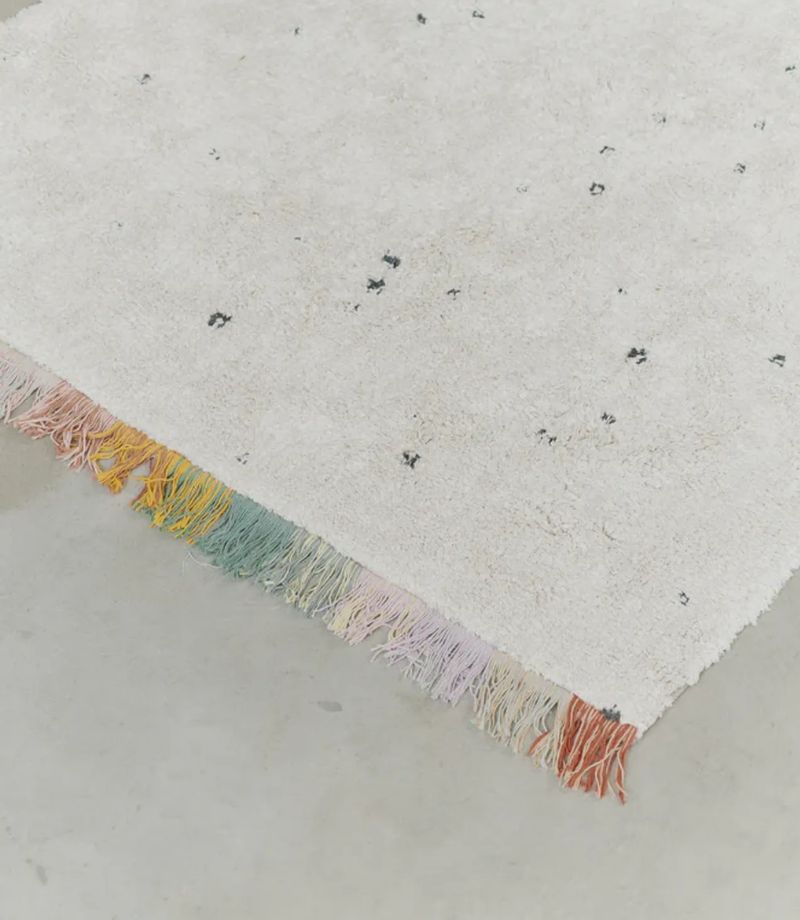 Αυτό το χειροποίητο ορθογώνιο χαλί, κατασκευασμένο από φυσικό βαμβάκι, διαθέτει χαριτωμένες σκούρες κουκίδες που μιμούνται τη διασκορπισμένη αστρόσκονη στο σύμπαν.