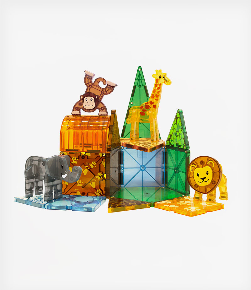 Η συσκευασία περιλαμβάνει : 5 μικρά τετράγωνα, 6 ισόπλευρα τρίγωνα, 2 ορθογώνια τρίγωνα, 4 σχήματα «Χ» με μοτίβο,1 Arch, 2 ισοσκελή τρίγωνα, 1 πεντάγωνο, 1 πίθηκος, 1 καμηλοπάρδαλη, 1 ελέφαντας και 1 λιοντάρι.