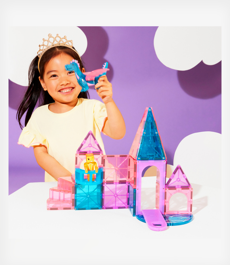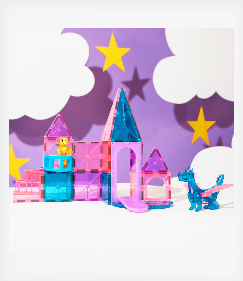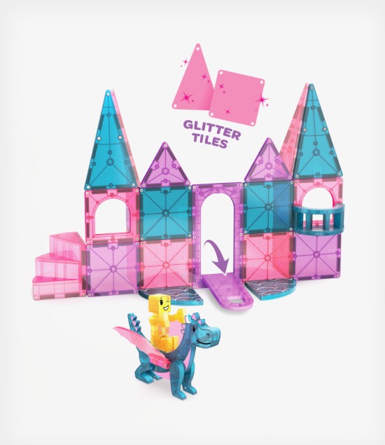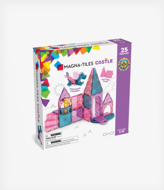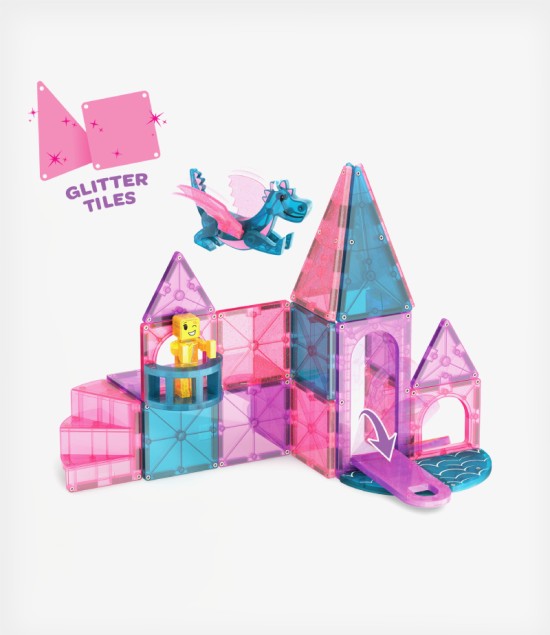 Τα παραμυθένια όνειρα γίνονται πραγματικότητα με το σετ MAGNA-TILES Castle 25 κομματιών. Χτίστε ένα κάστρο χρησιμοποιώντας τα αστραφτερά μαγνητικά πλακίδια και τα μοναδικά αξεσουάρ που θα βρείτε στο σετ, όπως την ανακλινόμενη γέφυρα, το μπαλκόνι και τη σπειροειδή σκάλα. Ανοίξτε τη γέφυρα για να μπείτε σε έναν θαυμαστό μαγνητικό κόσμο ή πετάξτε στους ουρανούς με την αποκλειστική φιγούρα του δράκου. Παρακολουθήστε τα παιδιά να δημιουργούν τις δικές τους παραμυθένιες περιπέτειες με απεριόριστες δυνατότητες αφήγησης και κατασκευαστικής διασκέδασης, ενώ ταυτόχρονα αναπτύσσουν το συντονισμού χεριού-ματιού και τις λεπτές κινητικές δεξιότητες.