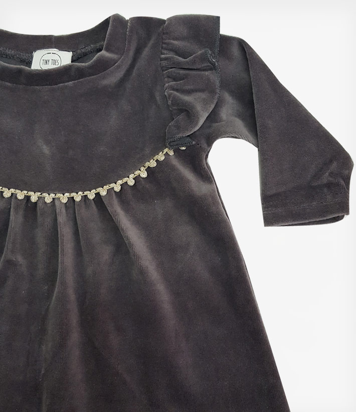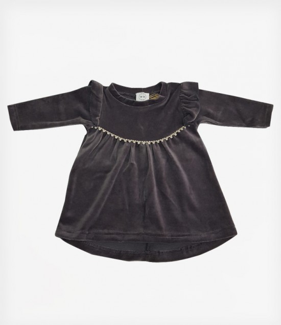 Φόρεμα από βελούδο και βολάν στα μανίκια με χρυσή δαντέλα στο μπροστινό μέρος.