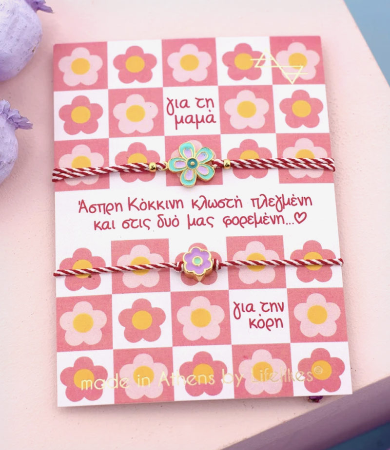 Χειροποίητα μαρτιάτικα βραχιόλια με βαμβακερό κορδόνι σε κόκκινο-λευκό χρώμα και χρυσά μεταλλικά λουλούδια με σμάλτο, για τη μαμά και την κόρη!