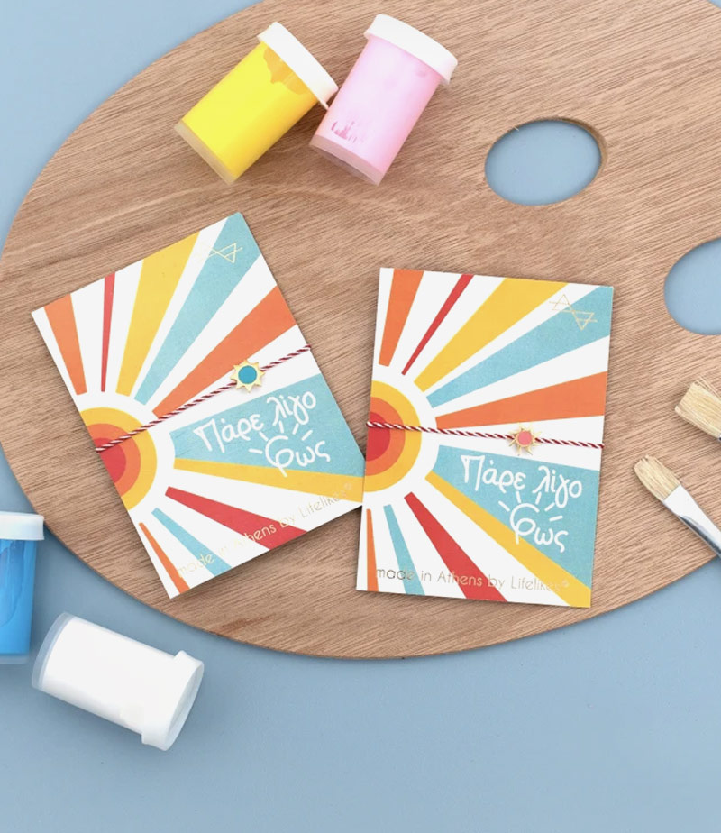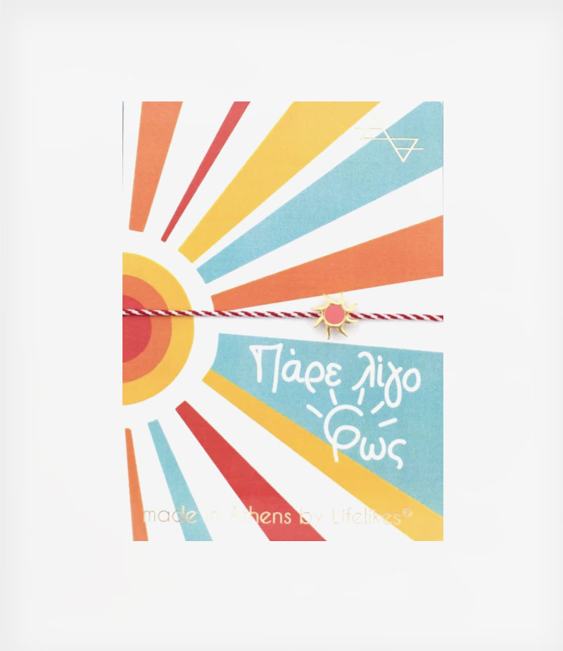 Χειροποίητο μαρτιάτικο βραχιόλι με βαμβακερό κορδόνι σε κόκκινο-λευκό χρώμα και χρυσό ήλιο με κοραλλί σμάλτο, για να υποδεχθείς την άνοιξη.