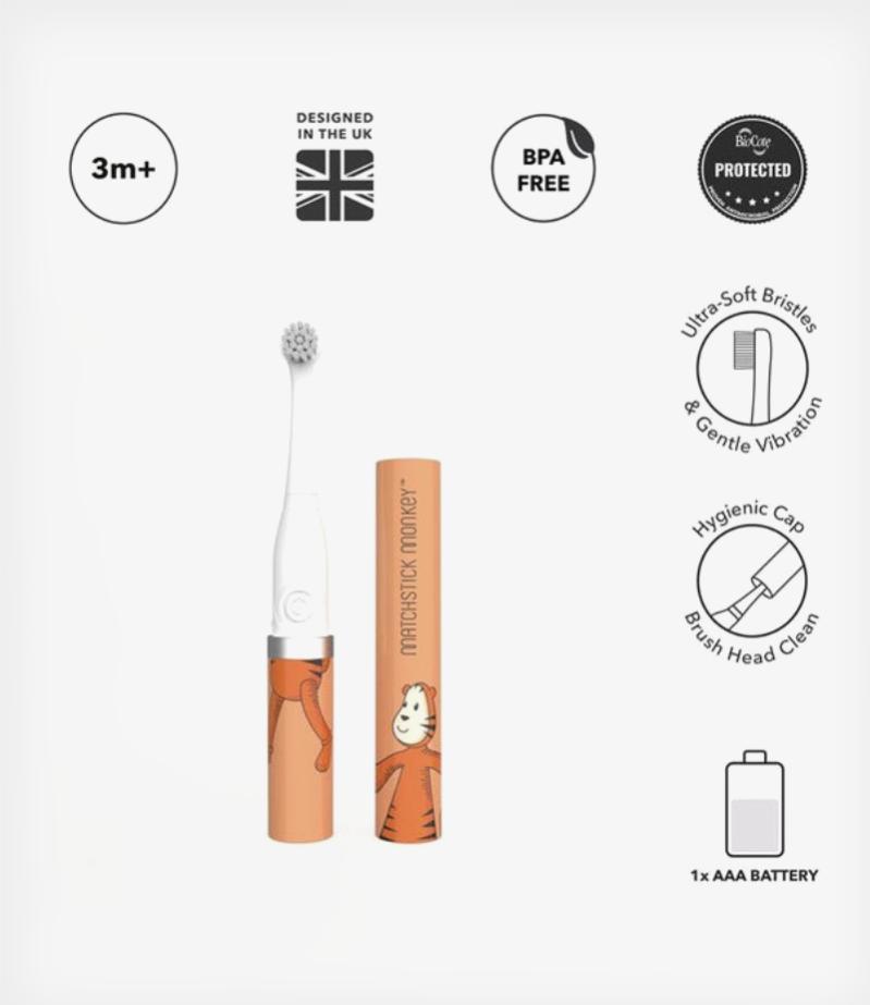 Η ηλεκτρική οδοντόβουρτσα λειτουργεί με μπαταρία, έχει ελεγχθεί για την ασφάλεια και περιλαμβάνει μια τυπική μπαταρία ΑΑΑ που μπορεί να αντικατασταθεί εύκολα. Συνοδεύεται από κεφαλή βούρτσας που μπορεί να χρησιμοποιηθεί για μωρά από 3-36 μηνών. Οι ανταλλακτικές κεφαλές μπορούν να αγοραστούν ξεχωριστά.