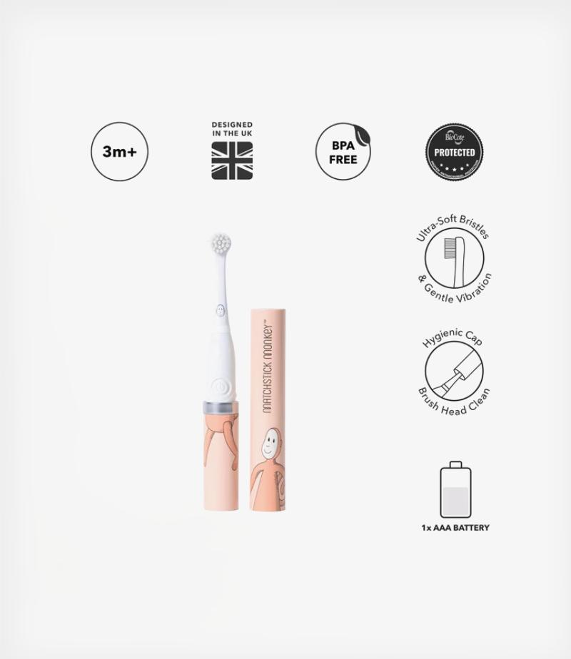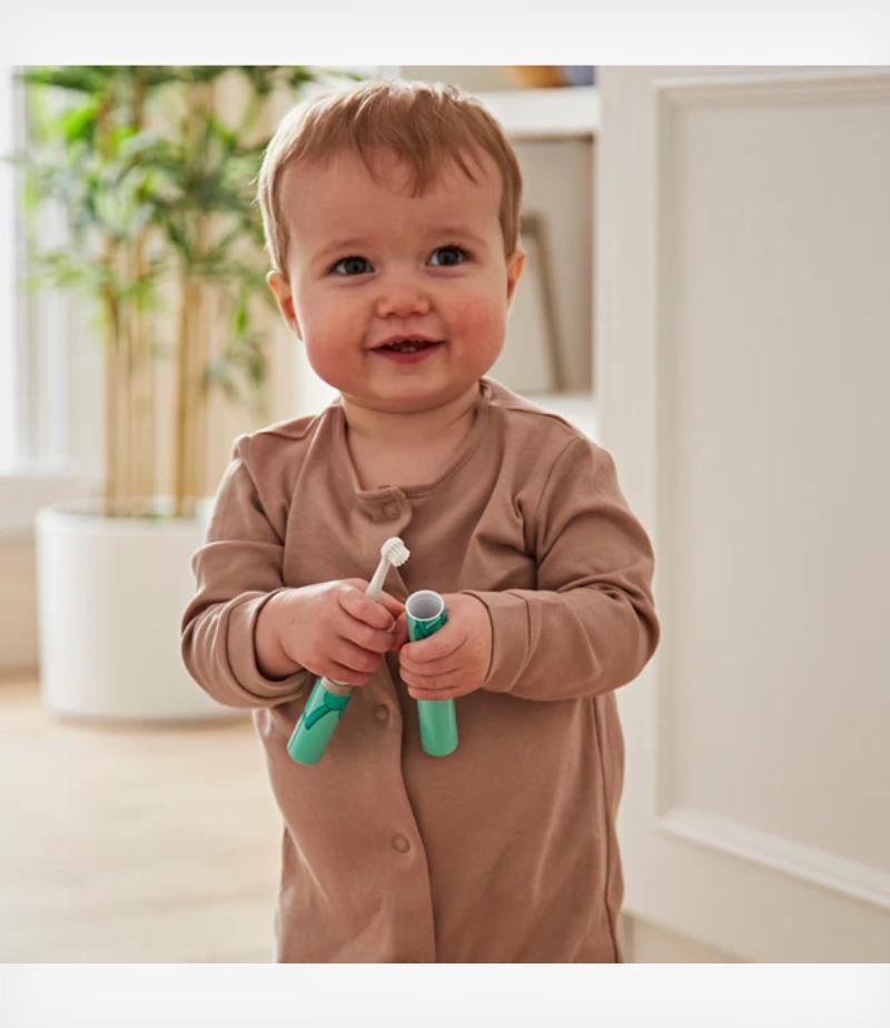 Η ηλεκτρική οδοντόβουρτσα λειτουργεί με μπαταρία, έχει ελεγχθεί για την ασφάλεια και περιλαμβάνει μια τυπική μπαταρία ΑΑΑ που μπορεί να αντικατασταθεί εύκολα. Συνοδεύεται από κεφαλή βούρτσας που μπορεί να χρησιμοποιηθεί για μωρά από 3-36 μηνών. Οι ανταλλακτικές κεφαλές μπορούν να αγοραστούν ξεχωριστά.