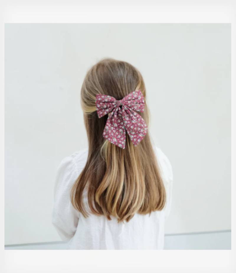 • Φιογκάκια δεμένα στο χέρι από πλούσιο μπορντό βελούδο και υφάσματα με λουλουδάτο εμπριμέ σε ένα κλιπ barrette 8 εκ.