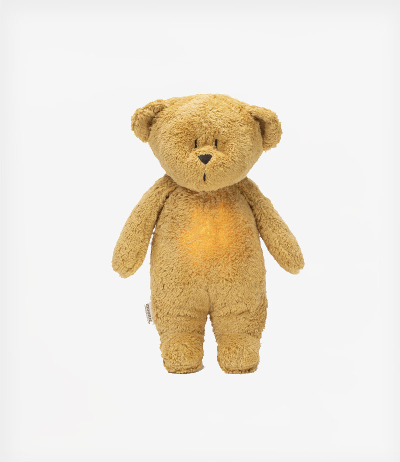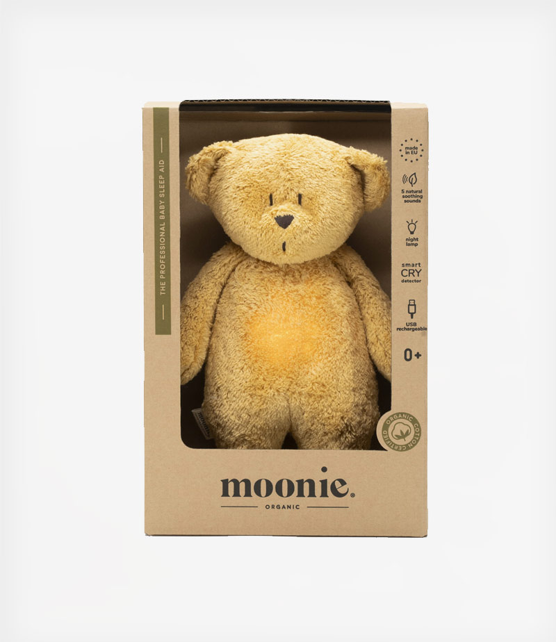 Το λούτρινο αρκουδάκι της εταιρείας Moonie αποτελεί έναν αξιόπιστο φίλο για τον ύπνο, σχεδιασμένο με γνώμονα τις μεταβαλλόμενες ανάγκες των παιδιών. Επιτρέπει στο παιδί να ηρεμήσει και να νιώσει ασφάλεια αναπαράγοντας ήχους καρδιακού παλμού μέσα από την κοιλιά της μαμάς, ροζ θορύβους, θαλάσσια κύματα ή νανούρισμα.