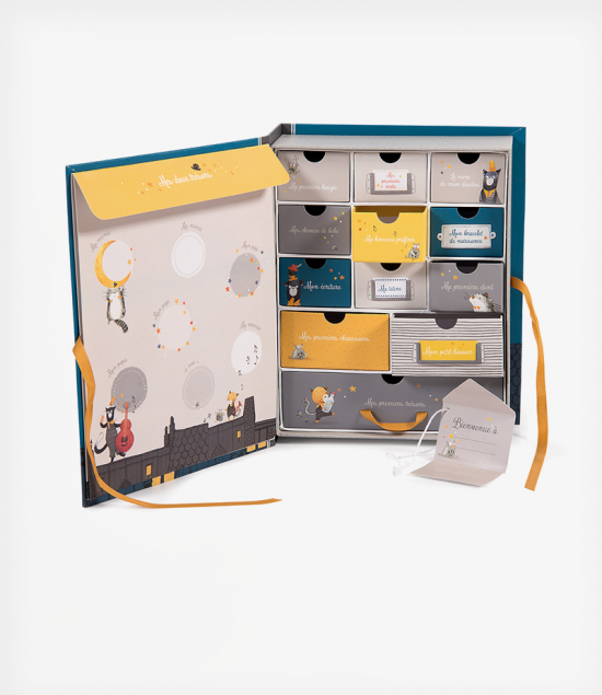 Ανακαλύψτε τον ζεστό και ευαίσθητο κόσμο της σειράς Moustache! Αυτό το όμορφο κουτί γέννησης που απεικονίζει μουσικές γάτες ανοίγει σαν ένα βιβλίο χάρη στον μικρό σύνδεσμο κορδέλας που βρίσκεται στο πλάι. Στην αριστερή σελίδα υπάρχει ένα οικογενειακό δέντρο για να το συμπληρώσετε με οικογενειακές φωτογραφίες, καθώς και ένας μεγάλος φάκελος για να κρατήσετε μέσα του συγχαρητήρια και προσκλητήρια..