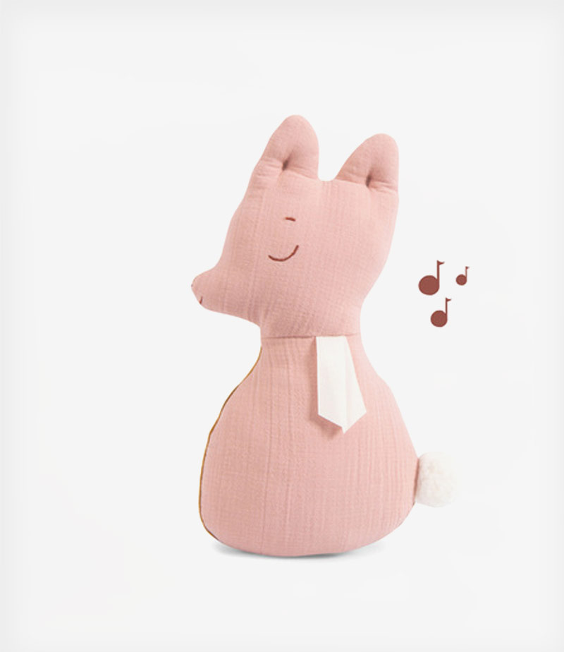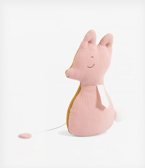 Το μαξιλάρι είναι παστέλ ροζ από τη μία πλευρά και ώχρα από την άλλη, με λεπτομέρειες κεντήματος και μια φουντωτή, γούνινη ουρίτσα. Είναι η ιδανική παρέα για το μωρό σας, αφού είναι μαλακό και χαρίζει μελωδικές στιγμές για τον ύπνο ή ακόμη και στη βόλτα.