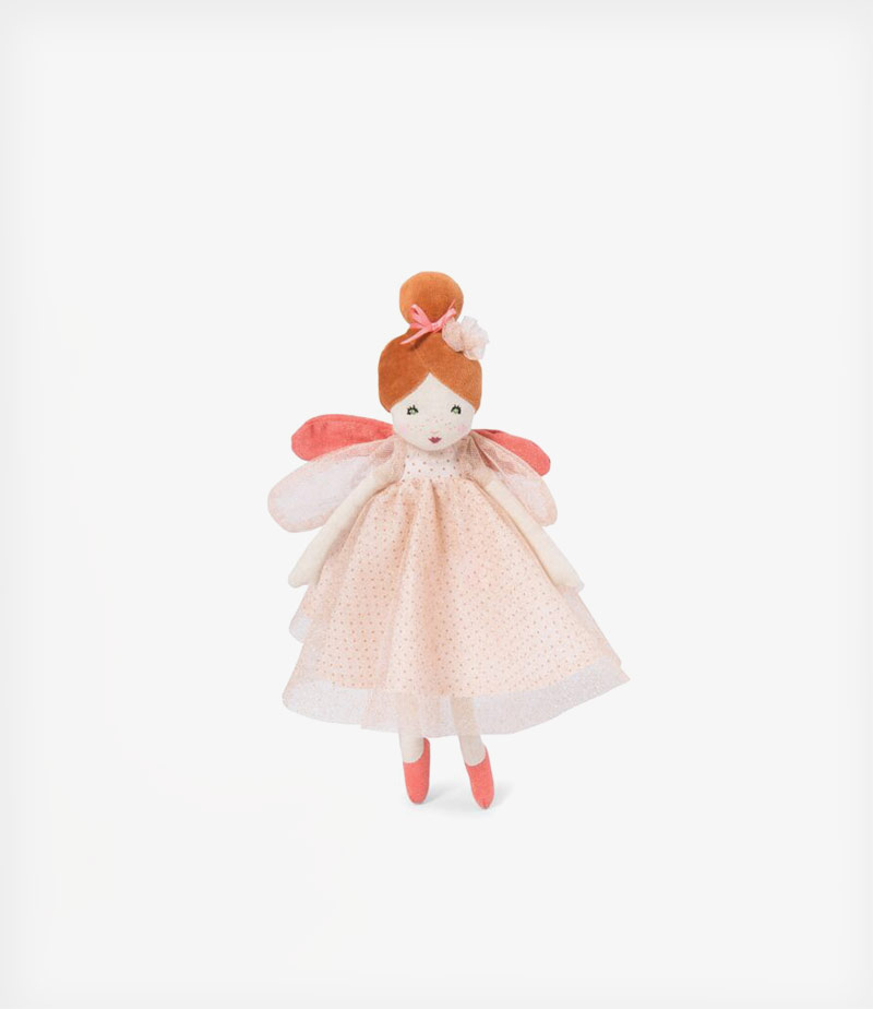 Αυτή η κούκλα Moulin Roty φοράει ένα ροζ πουά φόρεμα με χρυσό τούλι και γυαλιστερά φτερά στην πλάτη και μικρές λαμπερά παπούτσια.
