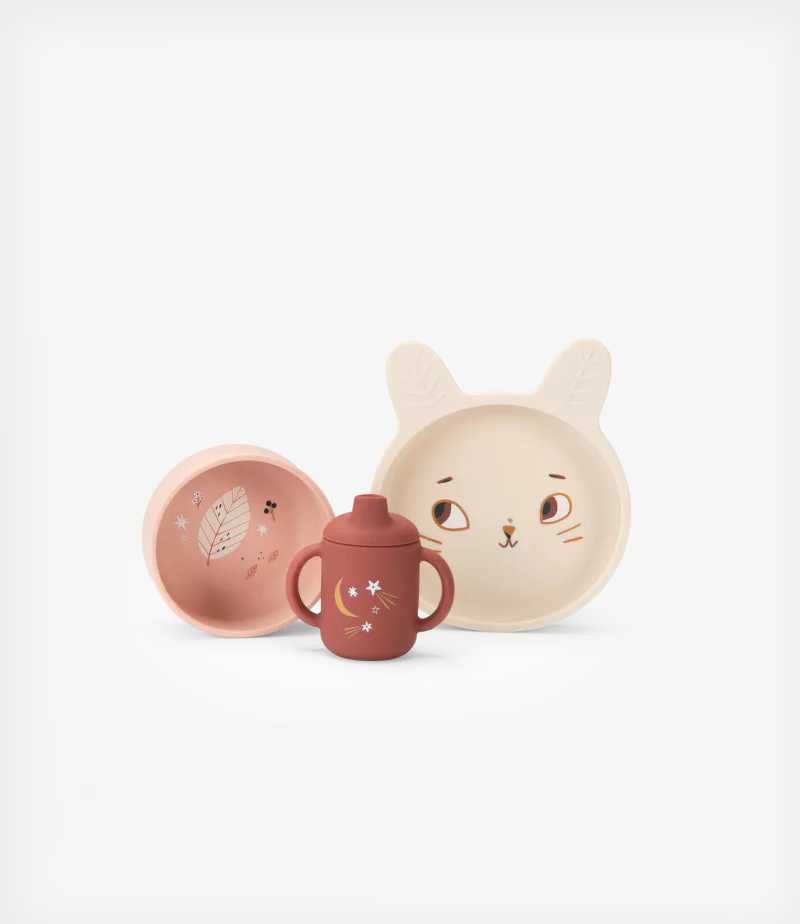 Ένα όμορφο σετ πιάτων από σιλικόνη, εικονογραφημένο με τρυφερότητα, στις χρωματικές αποχρώσεις της συλλογής “Μετά τη βροχή”, ιδανικό για να μπορούν τα μικρά παιδιά να τρώνε σαν μεγάλα. Το σετ περιλαμβάνει ένα μπολ, μία κούπα με λαβές και ένα πιάτο, ειδικά σχεδιασμένα για τα παιδιά. Είναι πρακτικό και κομψό, ενώ ταυτόχρονα ιδανικό για καθημερινή χρήση.