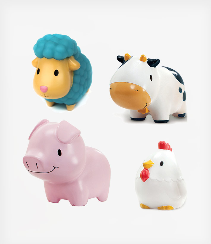 • Περιλαμβάνονται 4 ζωάκια που πιτσιλίζουν και επιπλέουν (αγελάδα, πρόβατο, κότα και γουρούνι)