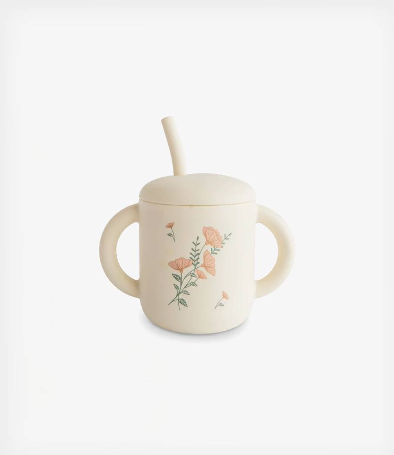 Mushie Εκπαιδευτικό Ποτήρι Σιλικόνης με Εργονομικές Λαβές και Καλαμάκι Pink Flowers