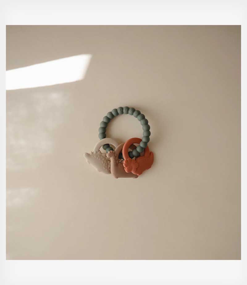 Βοηθήστε τα μικρά να εξερευνήσουν πλούσιες αισθήσεις, σχήματα και υφές με ένα δαχτυλίδι οδοντοφυΐας που περιλαμβάνει τρία προϊστορικά πλάσματα dino.